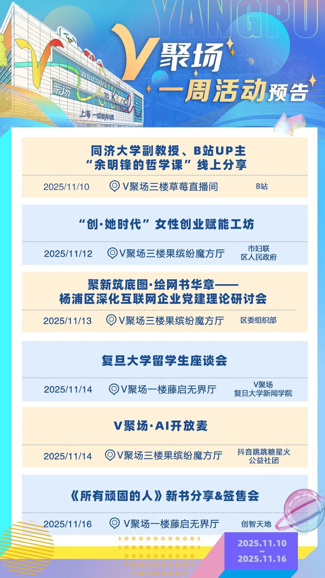 与千万粉丝“UP主”面对面互动,和B站、抖音、小红书等互联网大厂座谈交流,与AI领域创始人探讨人工智能发展新趋势……在杨浦V聚场,随时都有最前沿活动等你来打卡。无论你是互联网从业者,还是创意玩家……这里都将成为你迸发灵感的“能量场”。V聚场11月10日-11月16日一周活动预告来啦!快来碰撞灵感~