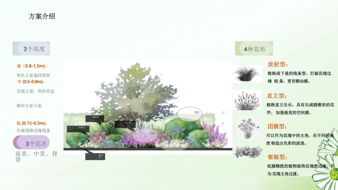 植物配置则兼顾季相特色与景观层次,采用矮生凌霄、芳香万寿菊、松果菊、金鸡菊、金光菊、小精灵山菅兰、绿叶山桃草、大炫蓝鼠尾草、墨西哥飞蓬、蒲棒菊、矮生翠芦莉等,以橙色系主导,多层次呼应主题。