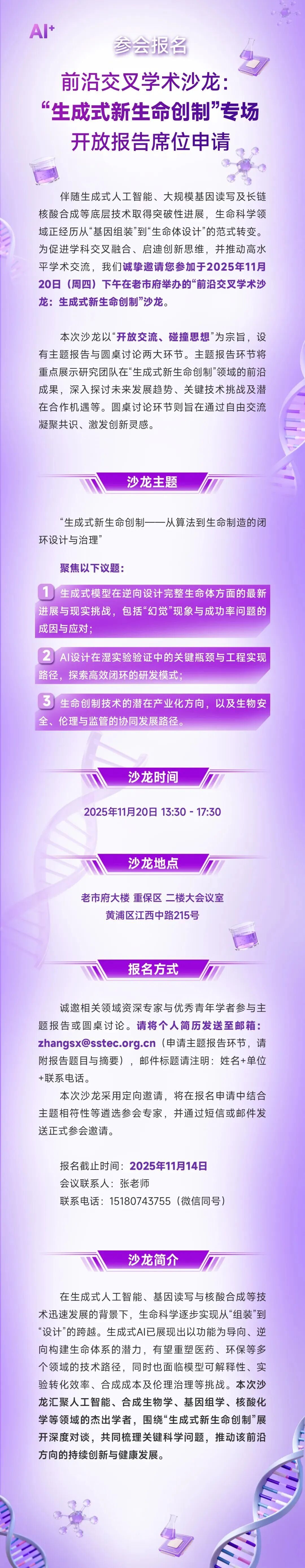 前沿交叉学术沙龙“生成式新生命创制”专场开放报告席位申请→