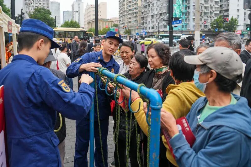 淮海中路街道的演练更是覆盖了商务楼宇和住宅小区。在SOHO复兴广场,白领们学习办公场所逃生要领;在复兴居民区,街道微型消防站的队员们正在向大家传授灭火器的使用方法。