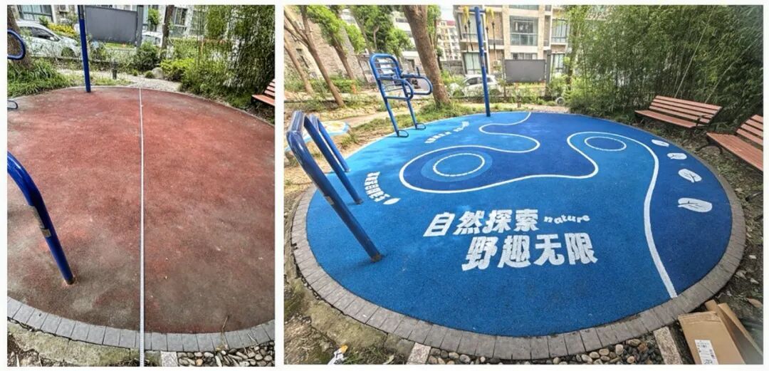 除了师生参与的艺术创作,小区内还创新设置了玻璃动物窗贴、野趣主题塑胶地面和小区常见昆虫知识翻板栏等互动装置,原本光秃秃的地面也得到了绿化补种。