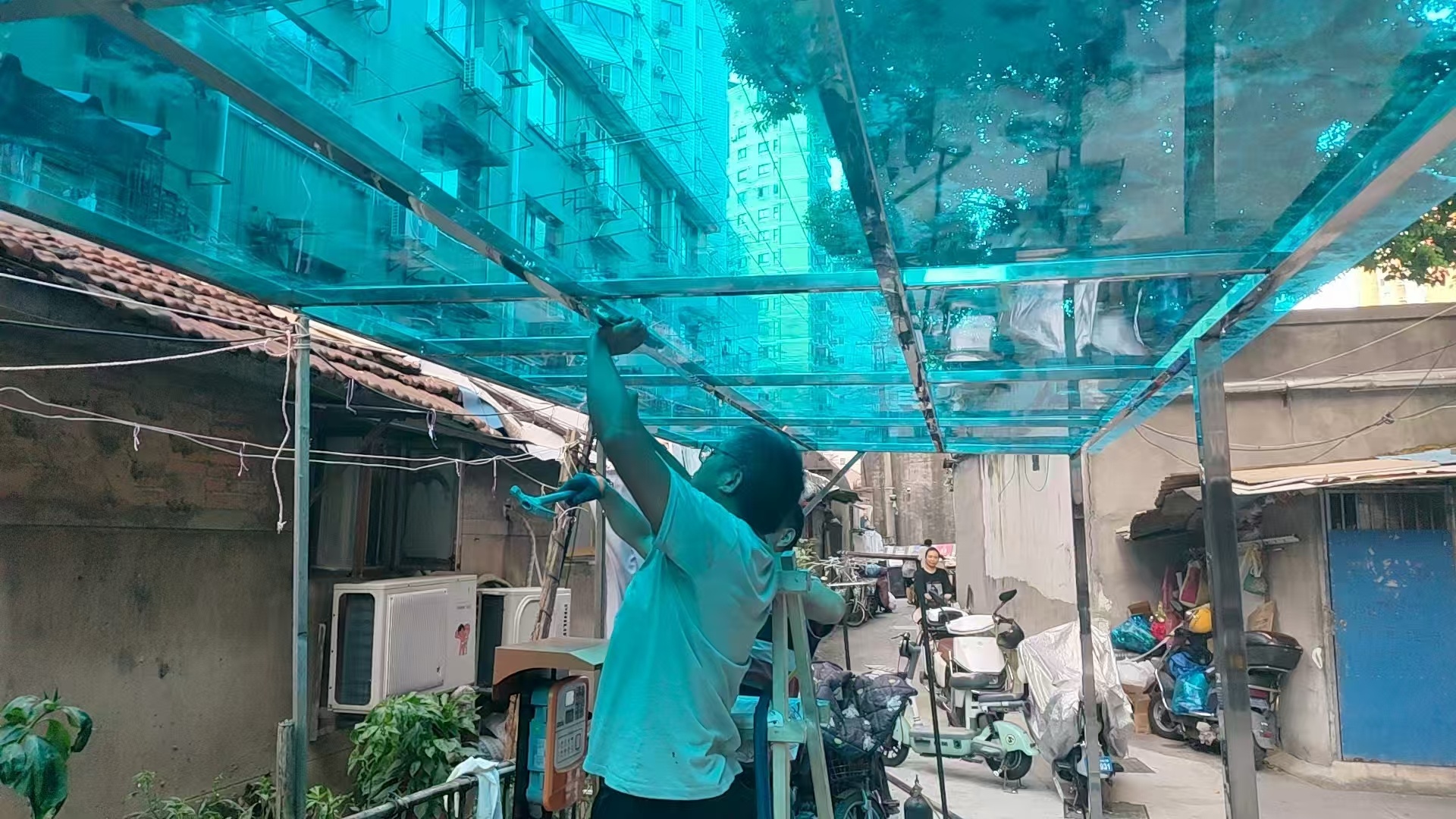 建于上世纪50年代的虬江路1258弄小区,基础设施相对落后。此前小区仅有的两个智慧充电桩由于缺乏顶棚,遇到雨天就让居民忧心忡忡。