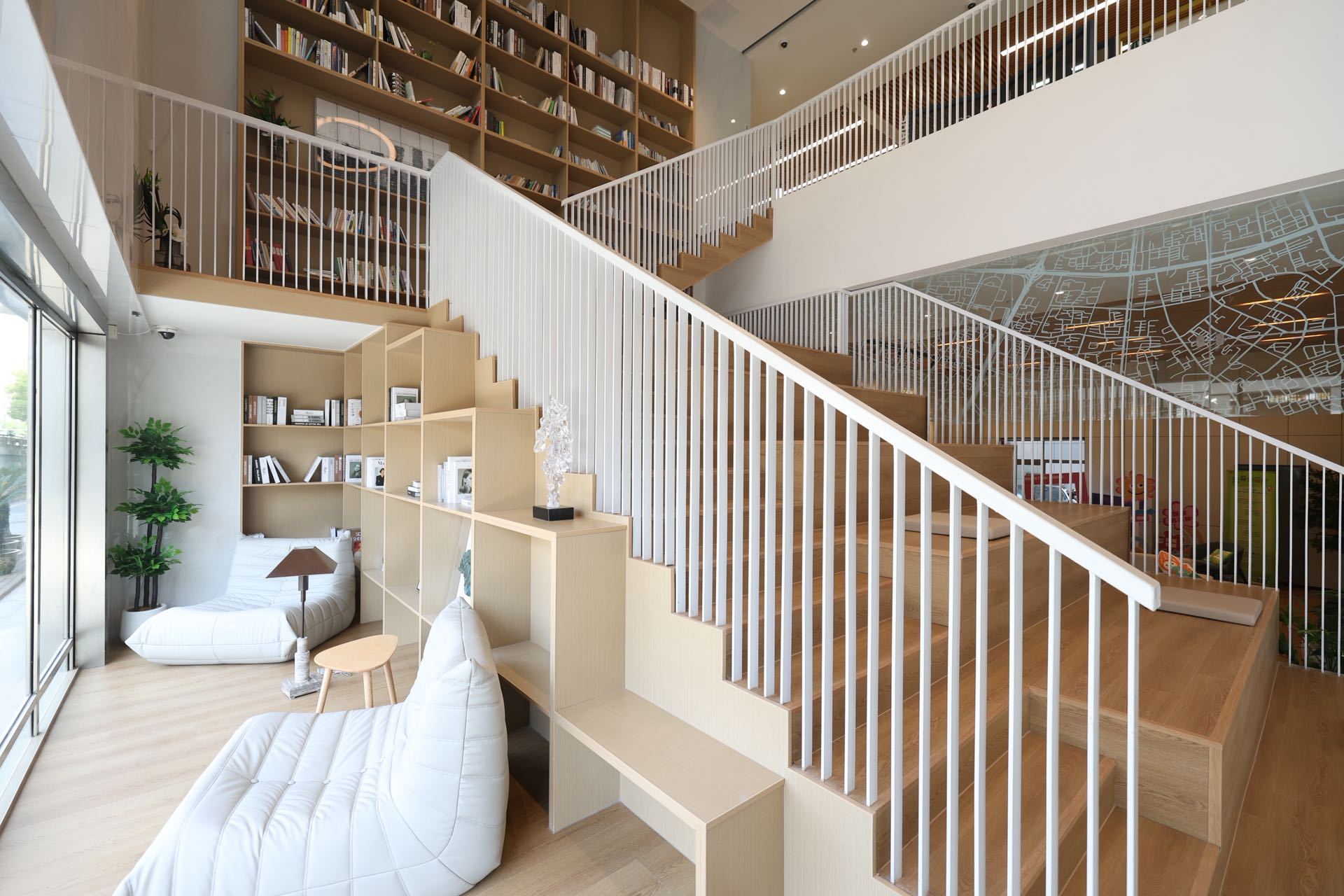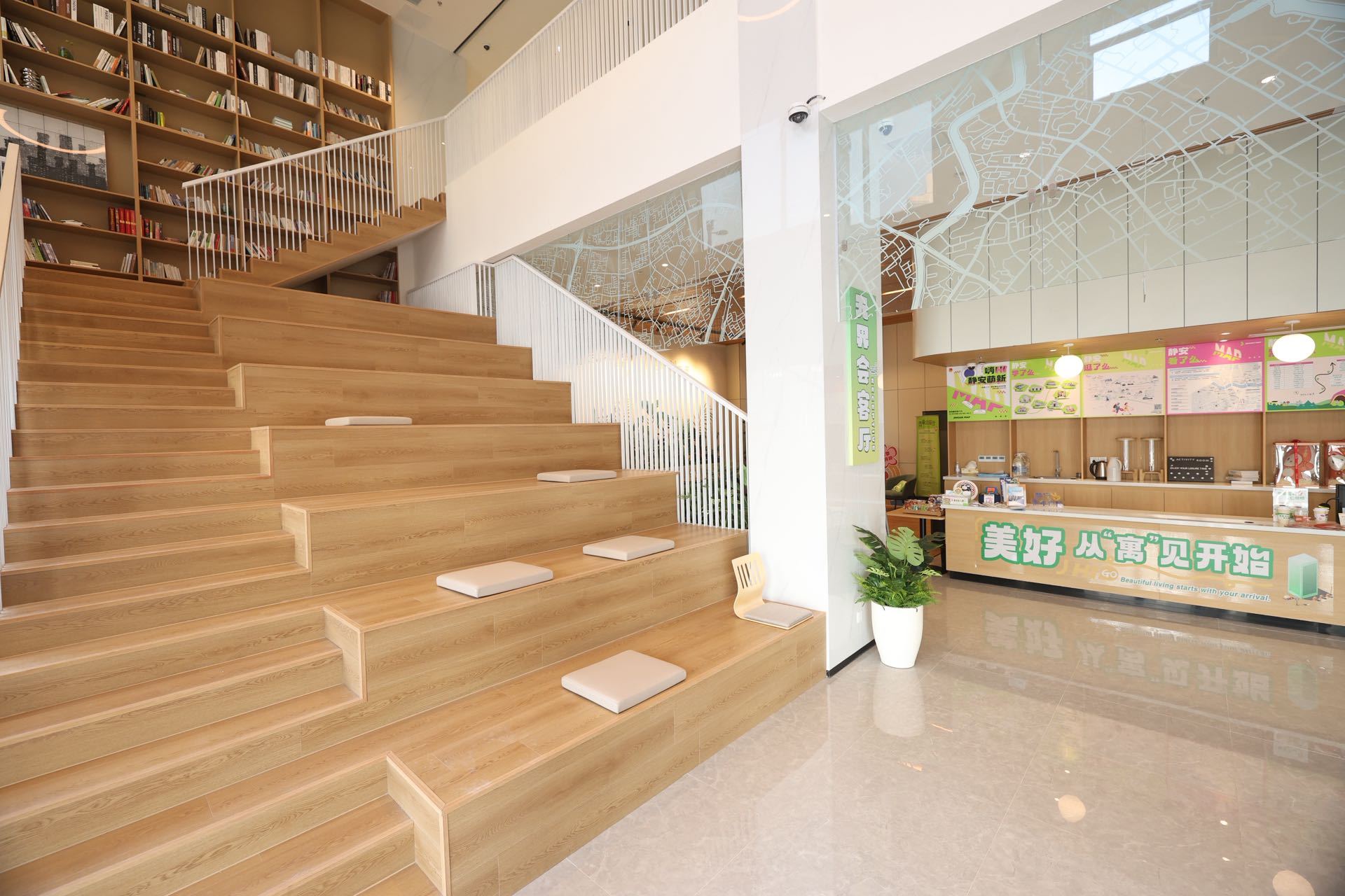推开公寓一楼大门,迎面而来的是开阔明亮的阶梯式活动空间。这里不仅是住户议事交流的“社区客厅”,也是举办各类活动的核心区域。墙壁上的展示柜摆放着各类书籍,未来还可由住户自由布置,展示个人手作、书籍与装饰物,共建共享文化角落。