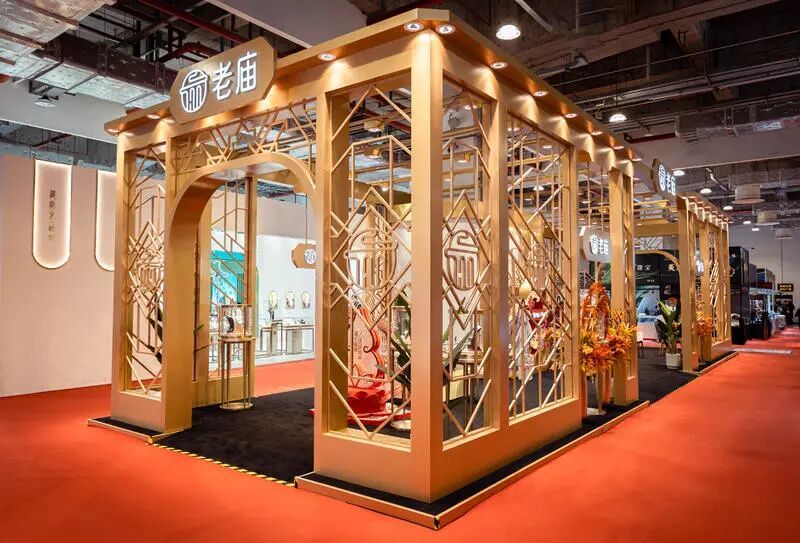 本次展会中,老庙x《天官赐福》动画联名系列、古韵金作系列、一串好运系列等明星产品,以及深受消费者喜爱的当季流行单品悉数亮相。老庙展台则延续品牌一贯的新中式风格,以暖金色为主调,融合古典纹饰与现代结构线条,营造兼具典雅与时尚气息的展示空间。
