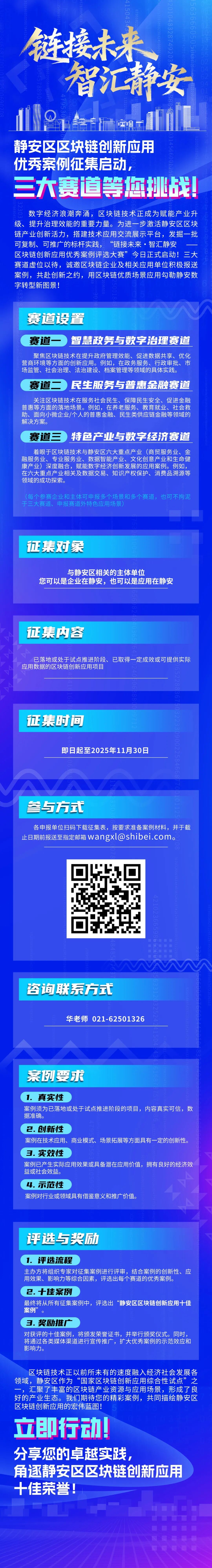 数字经济浪潮奔涌,区块链技术正成为赋能产业升级、提升治理效能的重要力量。为进一步激活静安区区块链产业创新活力,搭建技术应用交流展示平台,发掘一批可复制、可推广的标杆实践,“链接未来·智汇静安区块链创新应用优秀案例评选大赛”正式启动!