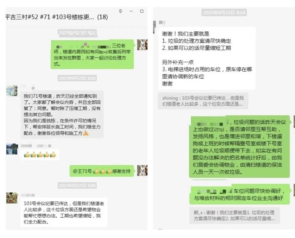 同时,“电梯更新沟通群”的成立为多方沟通搭建了桥梁。群内,由楼内居民民主推选产生的各楼道代表提出想法,而党总支、居委会、业委会、物业公司、代建单位、三菱电梯公司等代表及时回复。线上社群成为了民意汇聚、观点碰撞、寻求共识的有力平台。