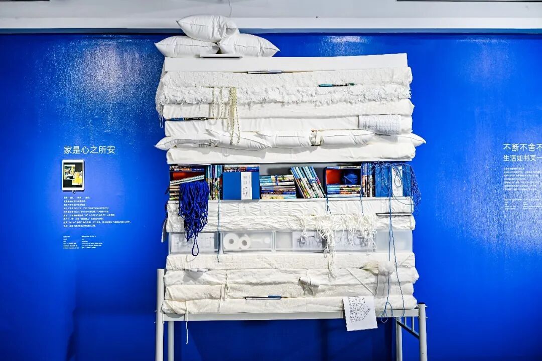 展出的作品中,《天天厨房》系列用玻璃钢雕塑与瓦楞纸绘画,构建出充满童趣的饮食宇宙;《家是心之所安》装置则以床褥、书籍等日常材料堆砌出“家”的意象,记录三十多年对家居与亲情的思考。《图腾都会》雕塑、《天下无有不散筵席?》装置以艺术化的视角重构沪港都市景观,既展现对城市发展的思考,也暗含对人文情感的珍视。