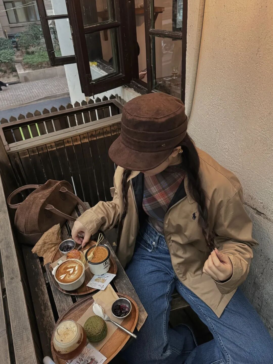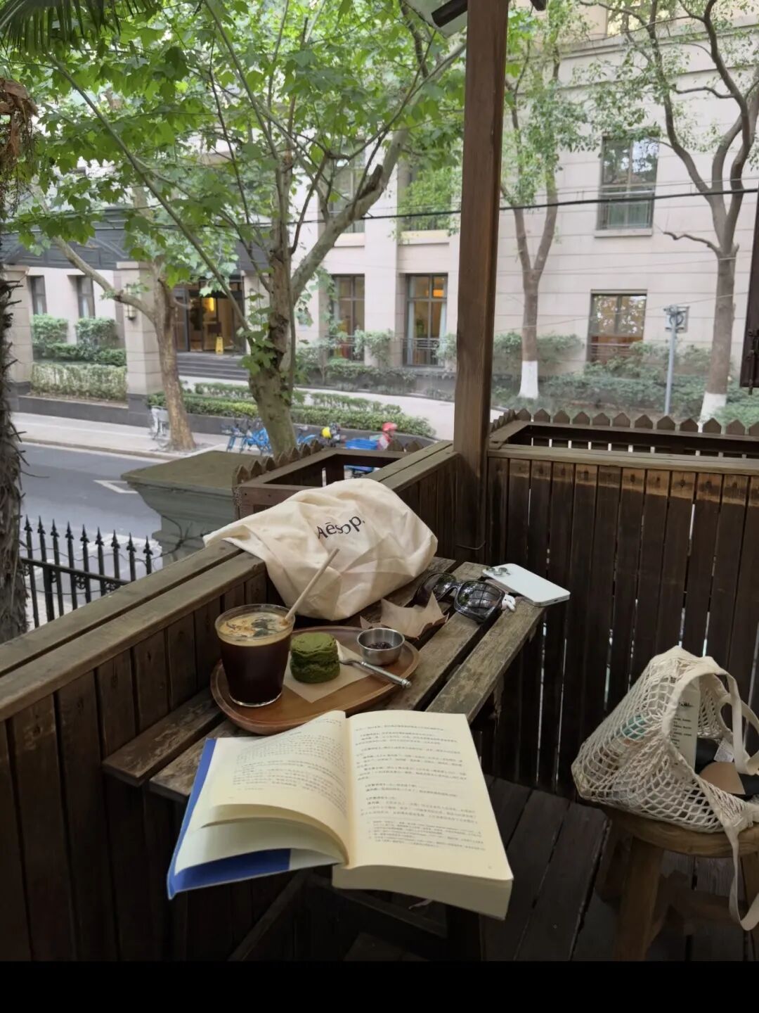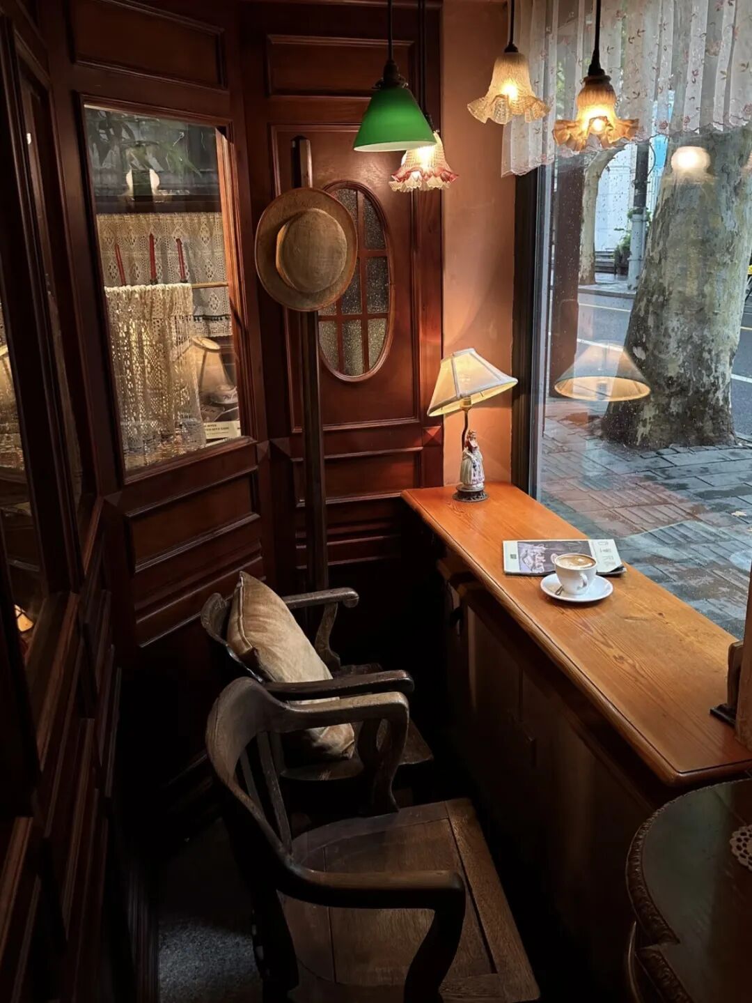 二楼的露台是这家店的最佳观景位,随着四季更迭,这里的景色也各有韵味。秋天,梧桐叶落进窗台,与店内的木质调相得益彰,安静又舒适。