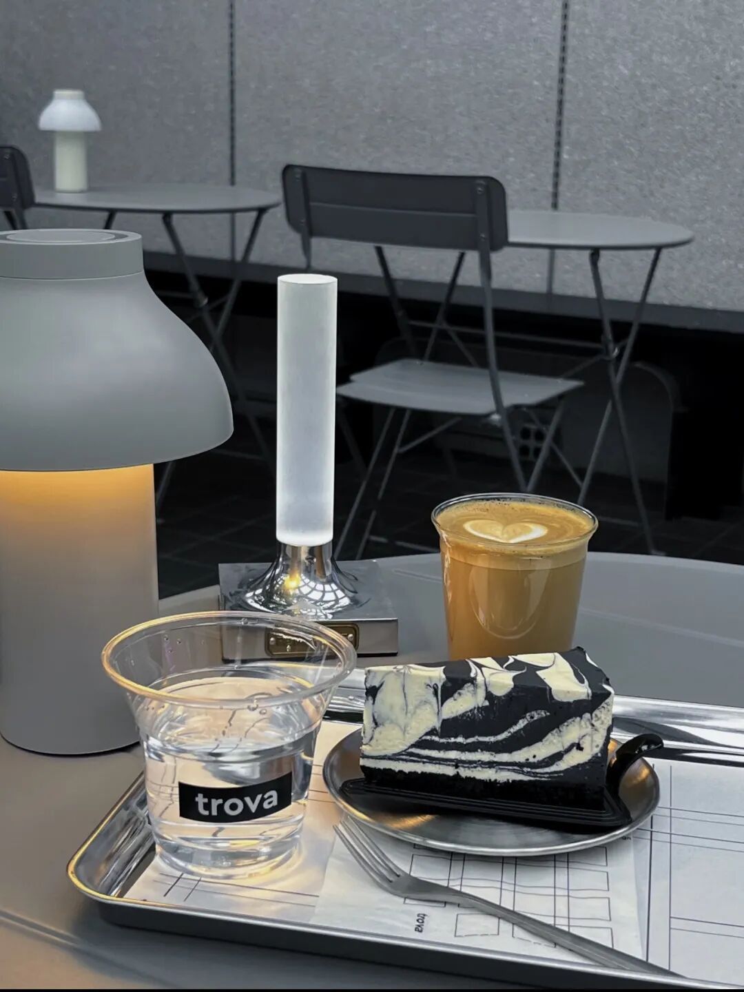 咖啡店的单色美学实验,店铺空间到平面视觉整体的色调都高度统一,空间被柔和的漫射光笼罩,未来科技感直接拉满。