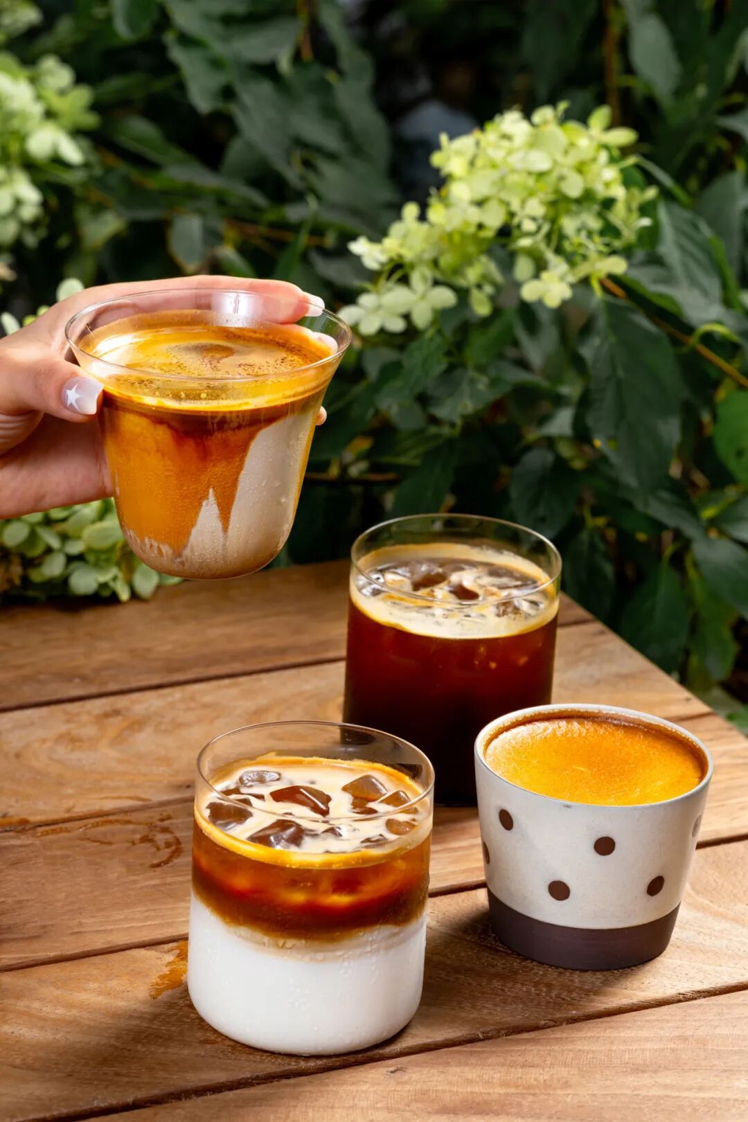 这里不仅有网红级创意特调,也有实力派手冲阵容。吧台上五个闻香瓶一字排开,里面是五款精心挑选的顶级手冲豆,足够满足认真喝咖啡的挑剔味蕾。