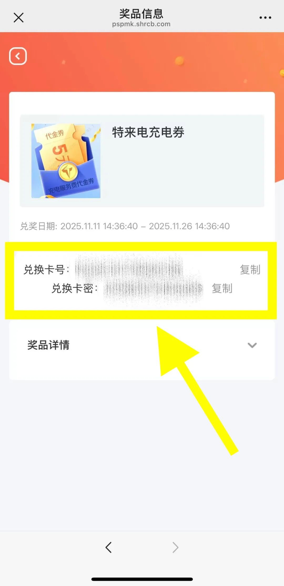 领取成功后,可在【我的奖品】中查看对应卡号和卡密,并前往“特来电”微信小程序,点击【我的-卡券-右上角+号-输入卡券编码-礼包】,根据页面提示输入【编码(卡号)+激活码(卡密)】后即可进行兑换绑定。