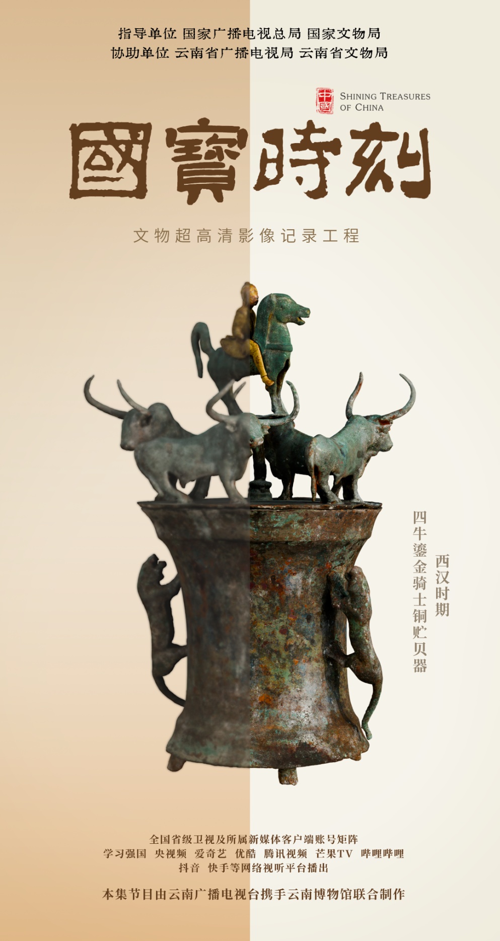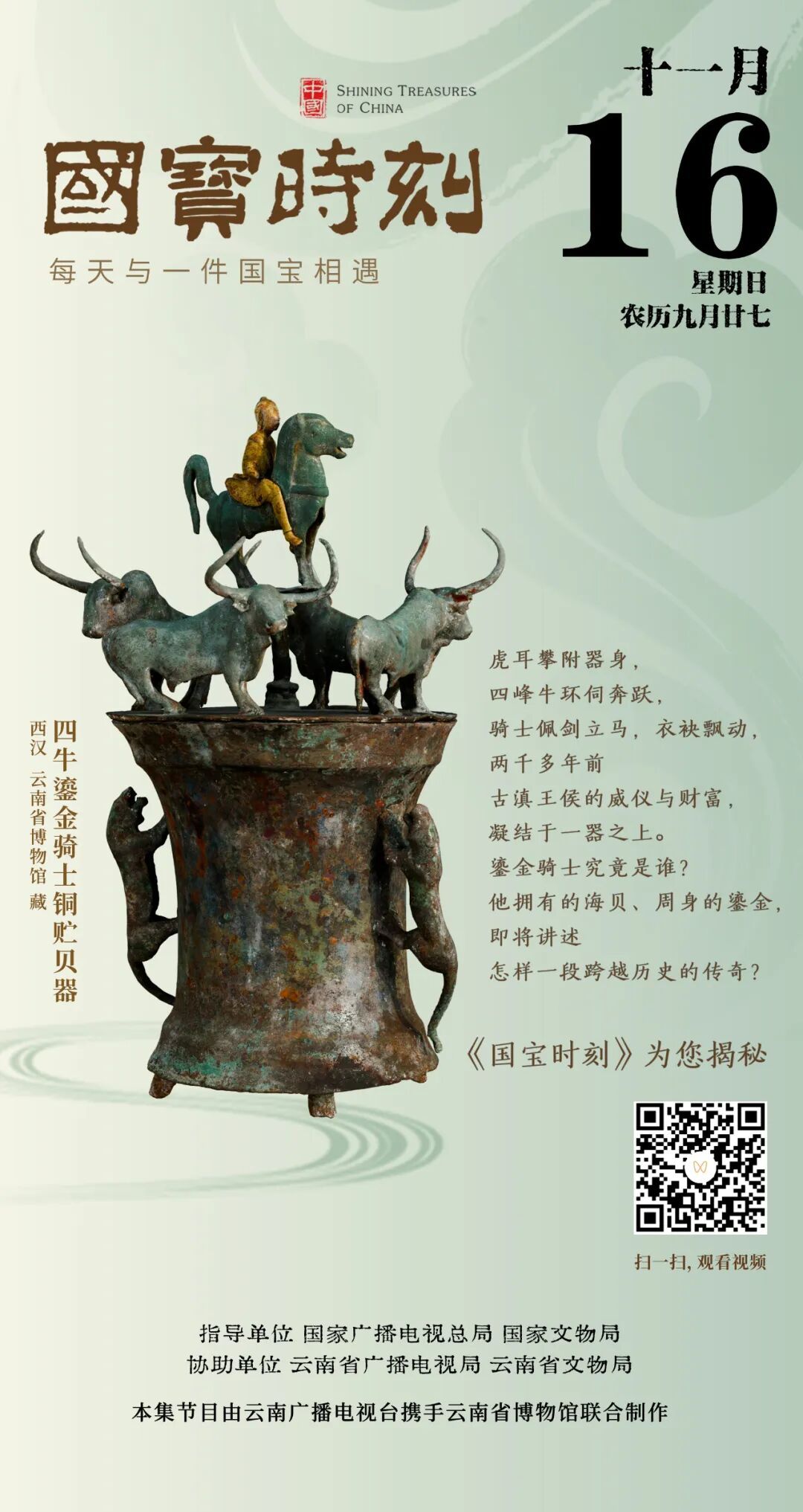 虎耳攀附器身,四峰牛环伺奔跃,骑士佩剑立马,衣袂飘动,两千多年前古滇王侯的威仪与财富,凝结于一器之上。鎏金骑士究竟是谁?他拥有的海贝、周身的鎏金,即将讲述怎样一段跨越历史的传奇?《国宝时刻》为您揭秘!来源:视听中国编辑:胡小凡