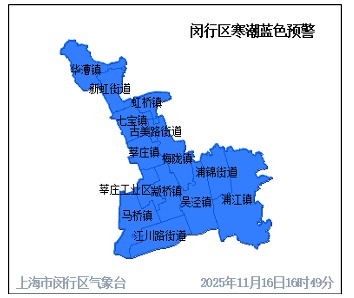 上海市闵行区气象台2025年11月16日16时49分发布寒潮蓝色预警信号: