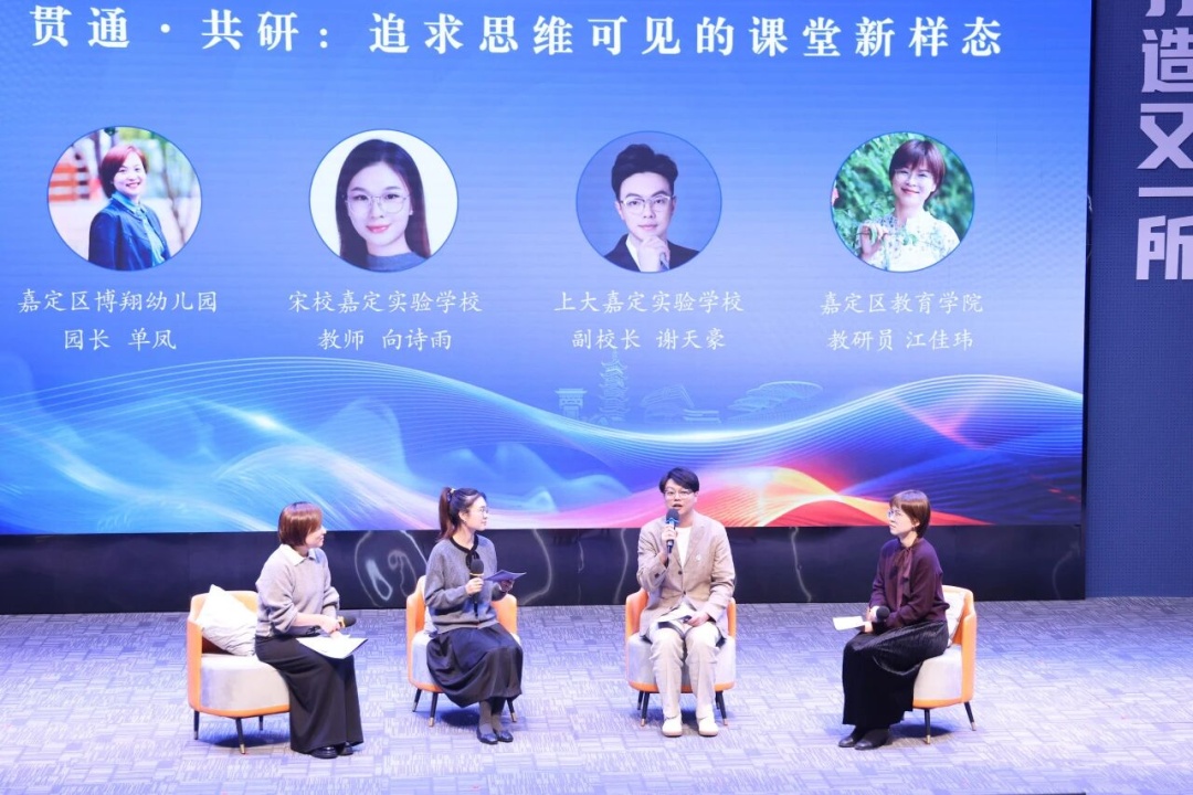 在“对话与观点”环节,博翔幼儿园园长单凤、上海大学附属嘉定实验学校副校长谢天豪、初中英语学科教研员江佳玮以及一线教师代表向诗雨围绕“学习如何真正发生”“怎样推动思维进阶”等问题展开深度研讨,分享了教学中的实践经验与思考。