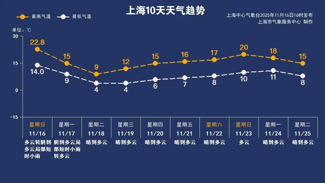 11月16日16时42分,上海中心气象台发布下半年首个寒潮蓝色预警信号:预计未来48小时内,全市最低气温将显著下降9—11℃,最低气温将下降到4℃以下,请注意防范大风、强降温及持续低温带来的不利影响。