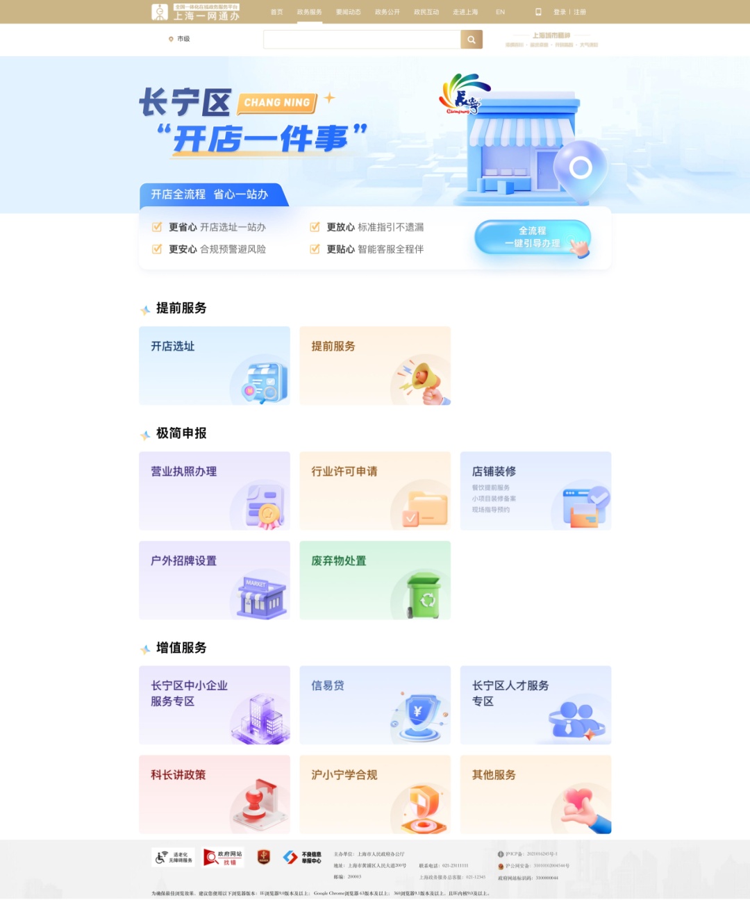 为规范统一流程手势,确保体验一致,长宁区还制定了全区一致的标准业务流程和办事指引,并以数字化、智能化为引领,建成便捷高效、体验友好的“开店一件事”线上服务平台,整合店铺选址、登记许可、小项目装修备案等21项办理事项和22项服务事项,提供线上线下两个集成式办理渠道,在全区实现同事同标,让经营主体获得同质同效的服务。