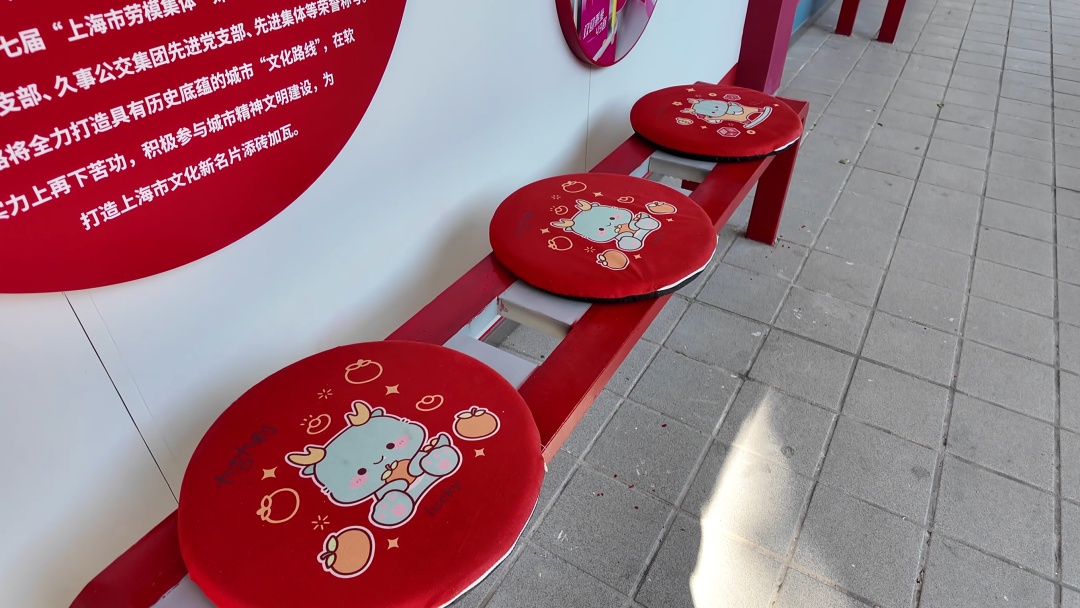 走出休息室,来到户外的候车长廊,同样能感受到49路公交的用心。候车长椅上已经全部铺上了柔软的坐垫,原本冰冷的座椅变得温暖又舒适。这些坐垫不仅为乘客抵御了寒冷,还为整个候车区域增添了一抹热闹喜庆的氛围。