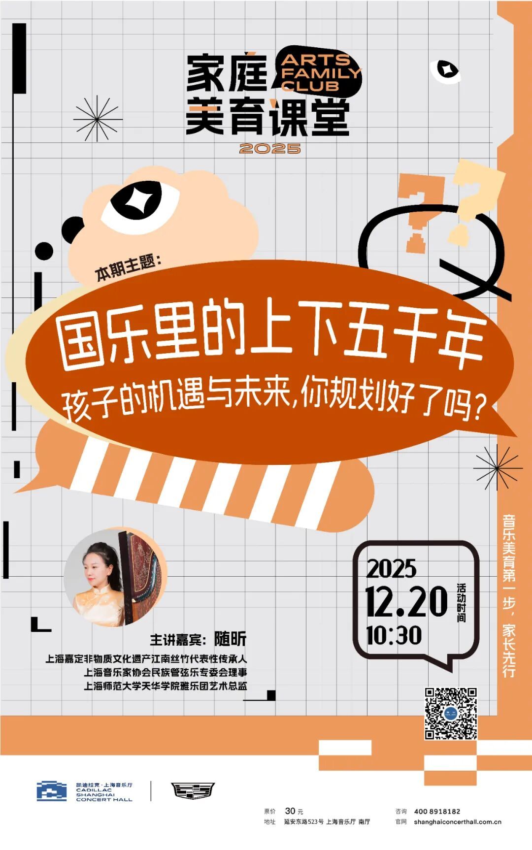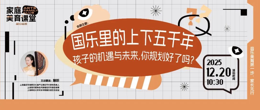 12月20日,上海嘉定非遗“江南丝竹”代表性传承人随昕老师将带来这场家庭美育课堂,用专业解读与沉浸式体验,为你一一解答,让孩子在国乐中连接传统与未来。