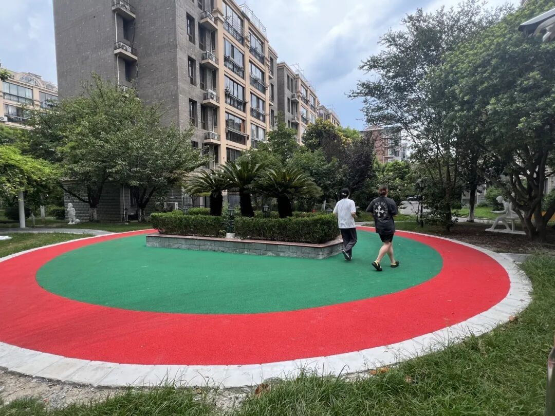 将原本中心广场的碎裂旧砖,铺设成透水塑胶,外圈红色快跑道环200米、内圈绿色慢行道环180米,并行不悖,成功填补了小区“零公共运动场所”的空白。