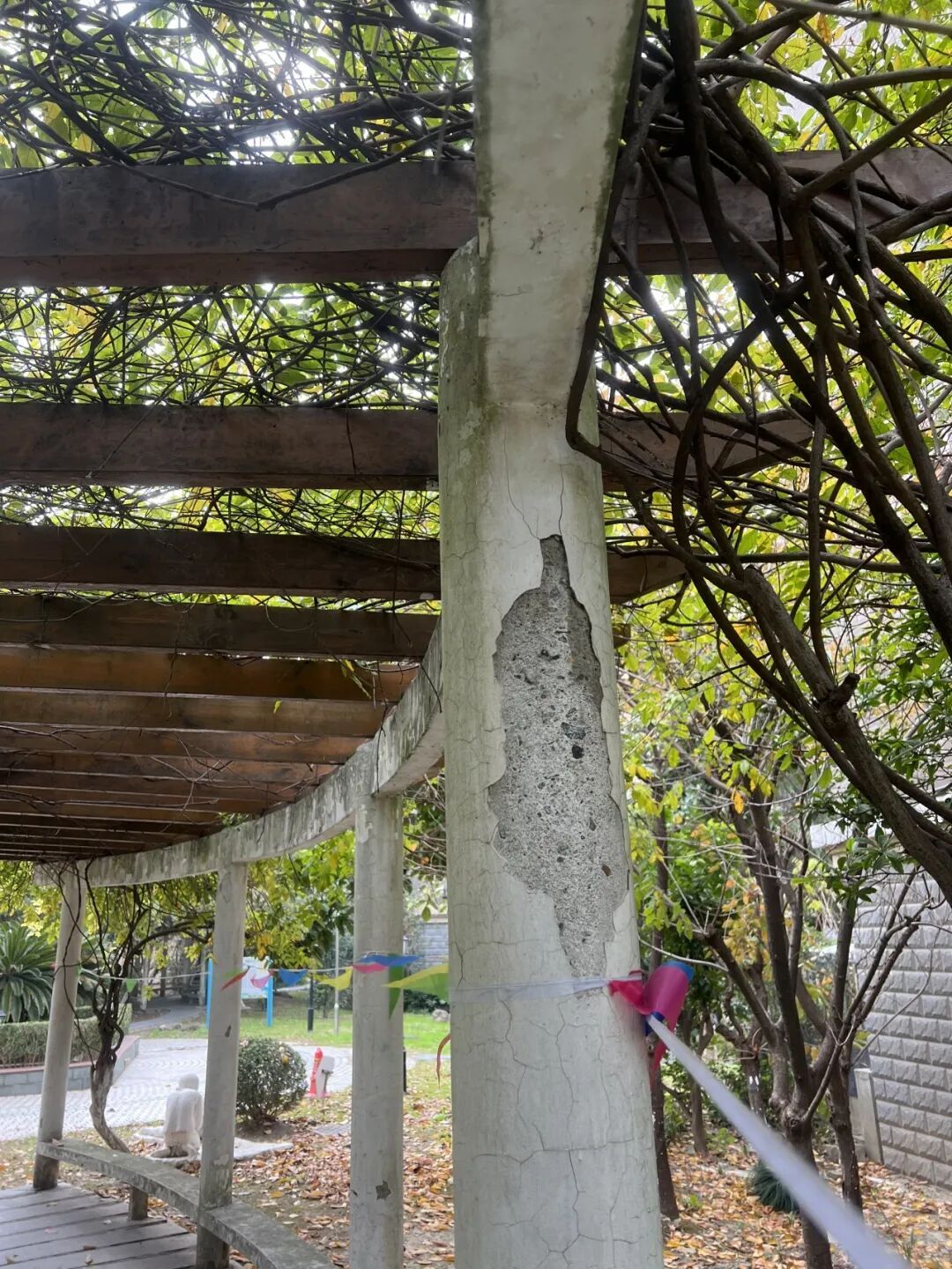 将紫藤长廊的老化木件整体打磨抛光,统一喷涂抗紫外线木蜡油,剥落的外立面同步粉刷同色真石漆,焕然一新,成为居民休闲议事、邻里聊天的“共享客厅”。