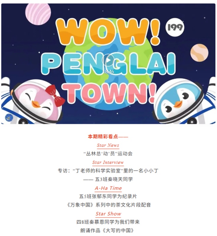 人气节目的荧屏内外,活跃的主角都是“蓬莱小镇”的孩子们:节目策划、栏目主播、出镜演绎……每期《Wow! Penglai Town》都包含四个栏目:“HiHi Star News”,播报校园一周要闻;“HeiHei Star Interview”专访各具闪光点的学生,传递榜样的力量;“A-Ha Time”则是英语配音栏目,各种有趣的动画、电影情节中,是孩子们自己的流利配音;在“Ta-da! Star show”里,每个学生都有机会成为校园里耀眼的明星,在科学实验、数学解题或才艺展示中定格“高光时刻”。