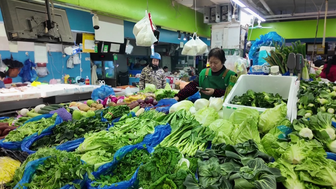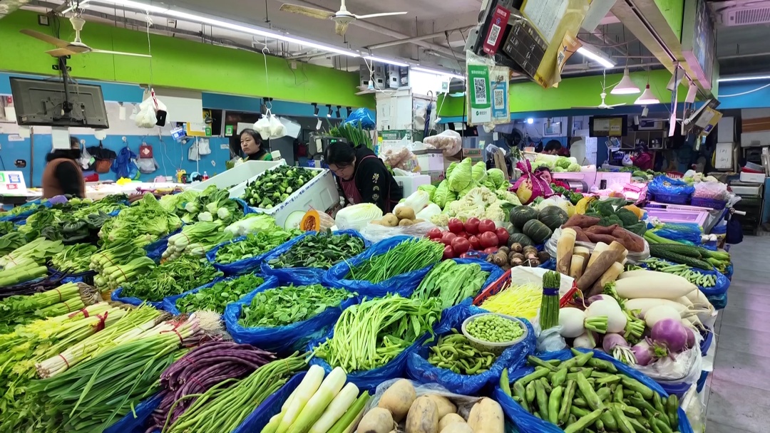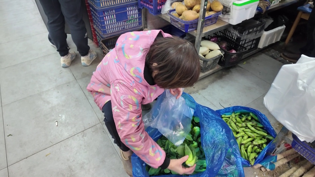 一位正在挑选青菜的市民满脸笑意地说:“这两天冷了,青菜开始变得好吃啦。我买点小青菜,再放点蘑菇一起炒,这可是打过霜的,特别甜,味道好极了。你看这青菜小小的,多新鲜,品质很不错。”