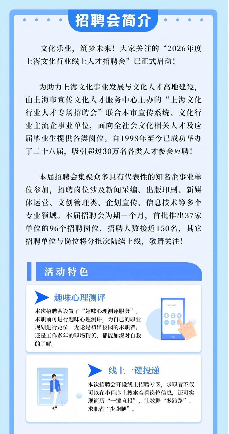 市宣传文化人才服务中心介绍,为期一个月的“2026年度上海文化行业线上人才招聘会”现已启幕,首批推出共96个招聘岗位,总招聘人数接近150人。后续招聘单位与岗位将陆续上线。