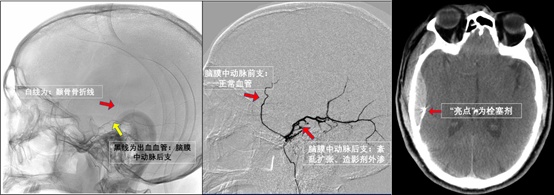 面对这一挑战,在神经外科团队主任医师冯东福指导下,全面评估后,决定为患者实施脑膜中动脉栓塞术,以降低血肿扩大风险,避免开颅手术。手术由侯雷博士主刀、王凯民主治医师协助,借助数字减影血管造影(DSA)技术精准定位破裂的脑膜中动脉后支,仅通过一个针眼大小的伤口成功完成栓塞。术后复查显示,患者血肿未再增加,病情稳定,数天后顺利出院,有效避免传统开颅手术的巨大创伤。