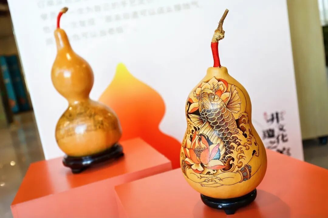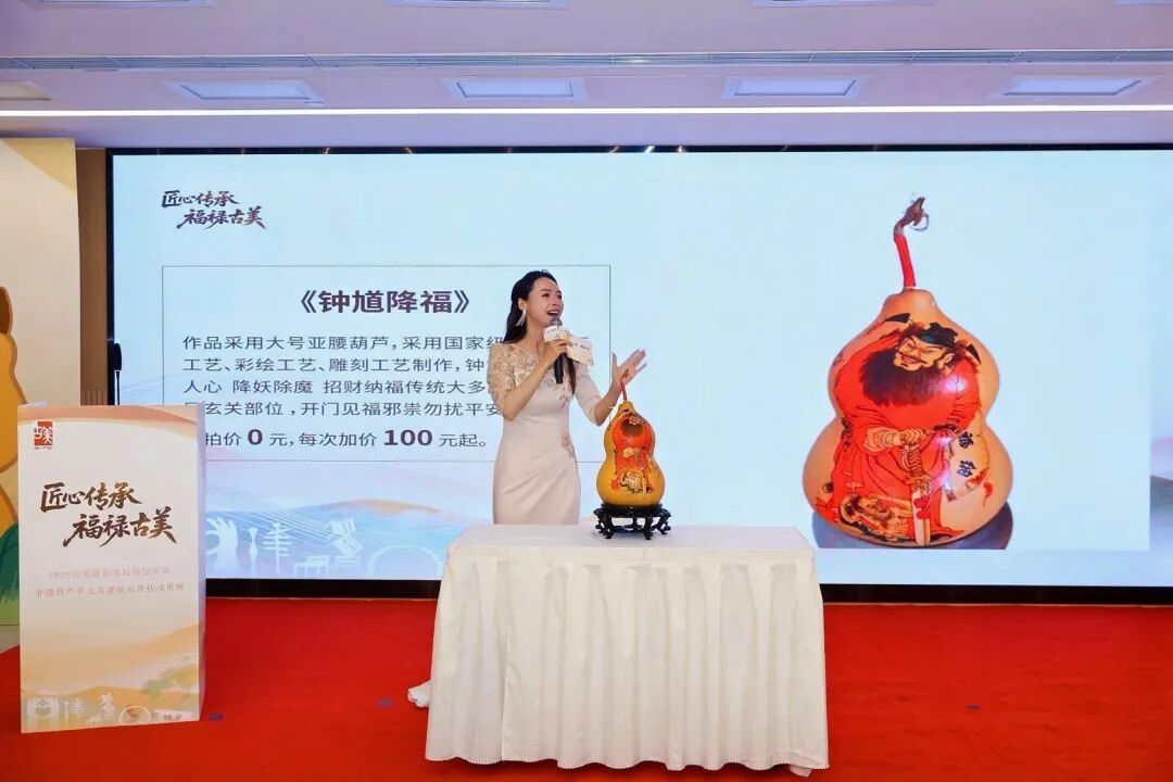 一葫一爱,传递温暖。在随后的爱心竞拍环节,16件学员亲手打造的葫芦作品登台亮相,这些作品各有巧思:刻“祥云”寄寓平安顺遂,绘“牡丹”象征富贵吉祥,雕“山水”承载诗意向往,每一件都饱含心意。