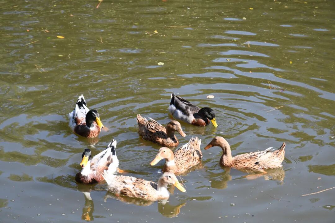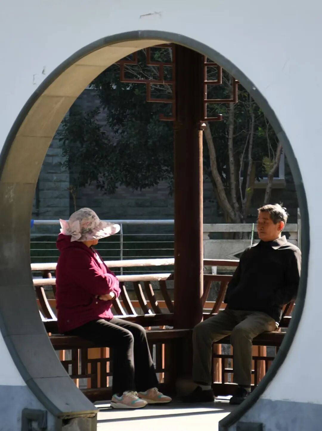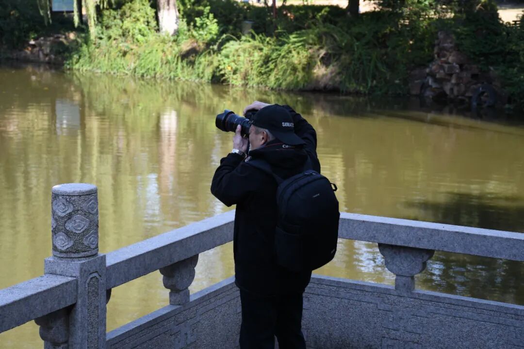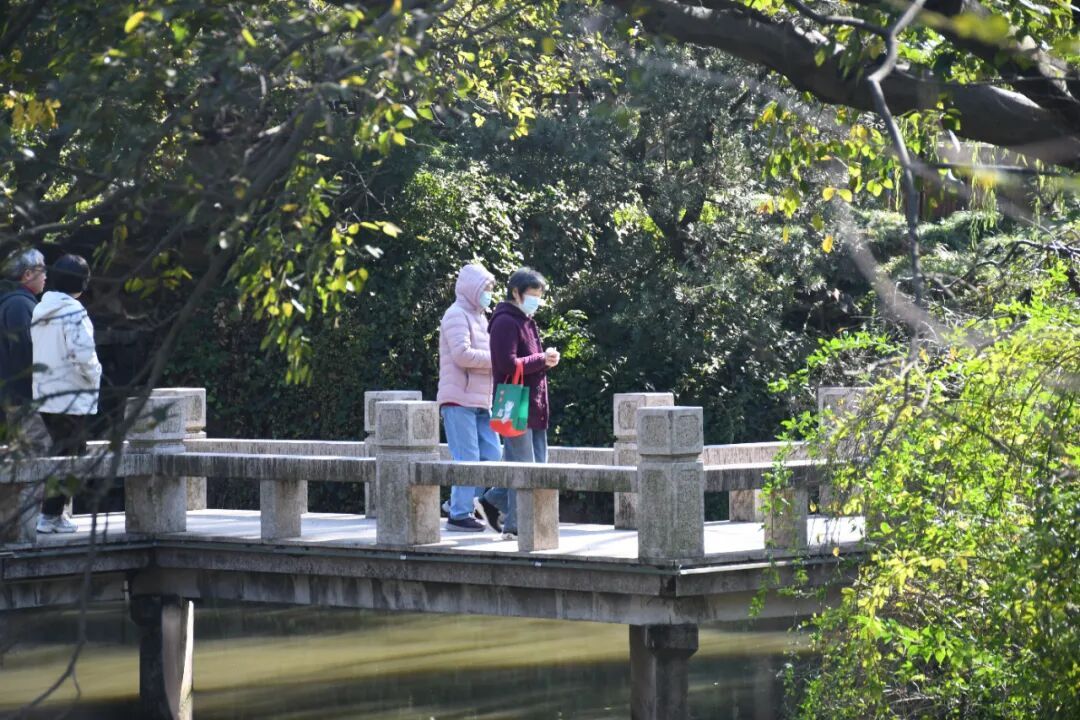 “冬江水冷鸭不知”,数只鸭子悠游水中,石桥上的摄影爱好者正在专注拍摄湖景与周边绿植