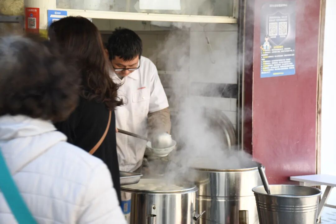 小吃摊摊主正为顾客盛上热气腾腾的食物,为冬日增添了一丝暖意