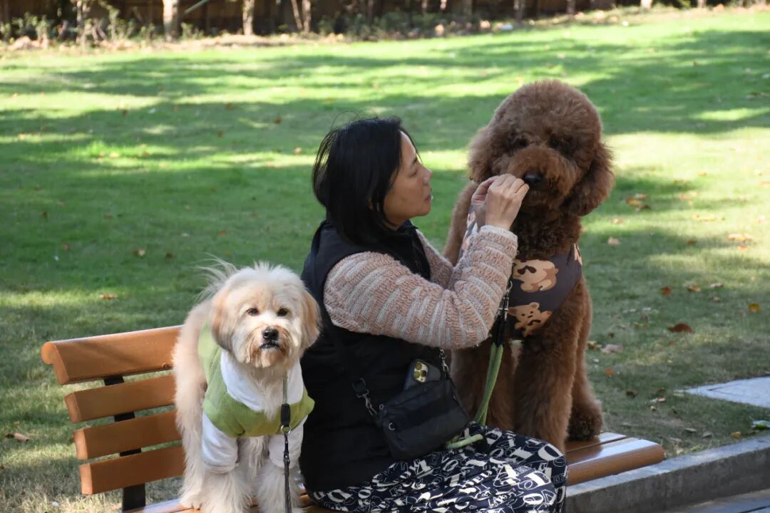 狗狗们也穿上了新衣服,狗主人正在和小狗们互动