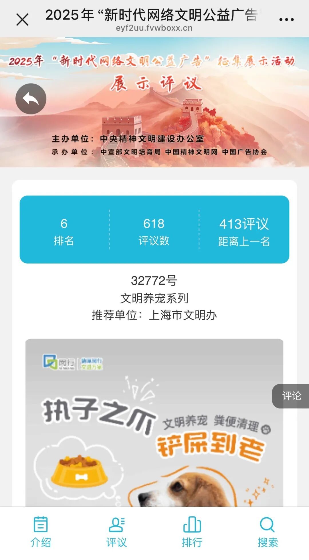 2025年“新时代网络文明公益广告”征集展示活动展示评议开始啦!市民游客朋友们动动手指,一起为32772号闵行区精神文明办的文明养宠系列点赞吧~评议通道开放自即日起至11月25日止,评议方式详见↓