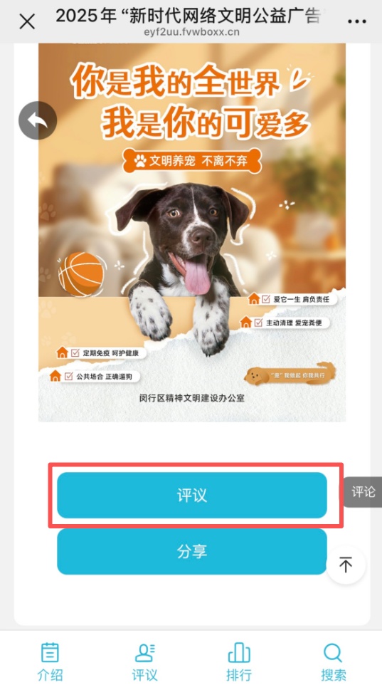 2025年“新时代网络文明公益广告”征集展示活动展示评议开始啦!市民游客朋友们动动手指,一起为32772号闵行区精神文明办的文明养宠系列点赞吧~