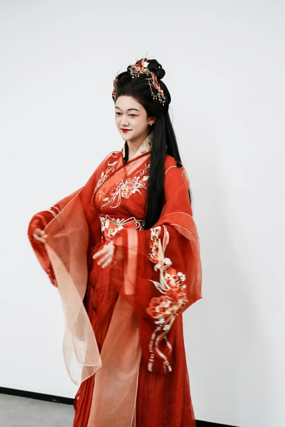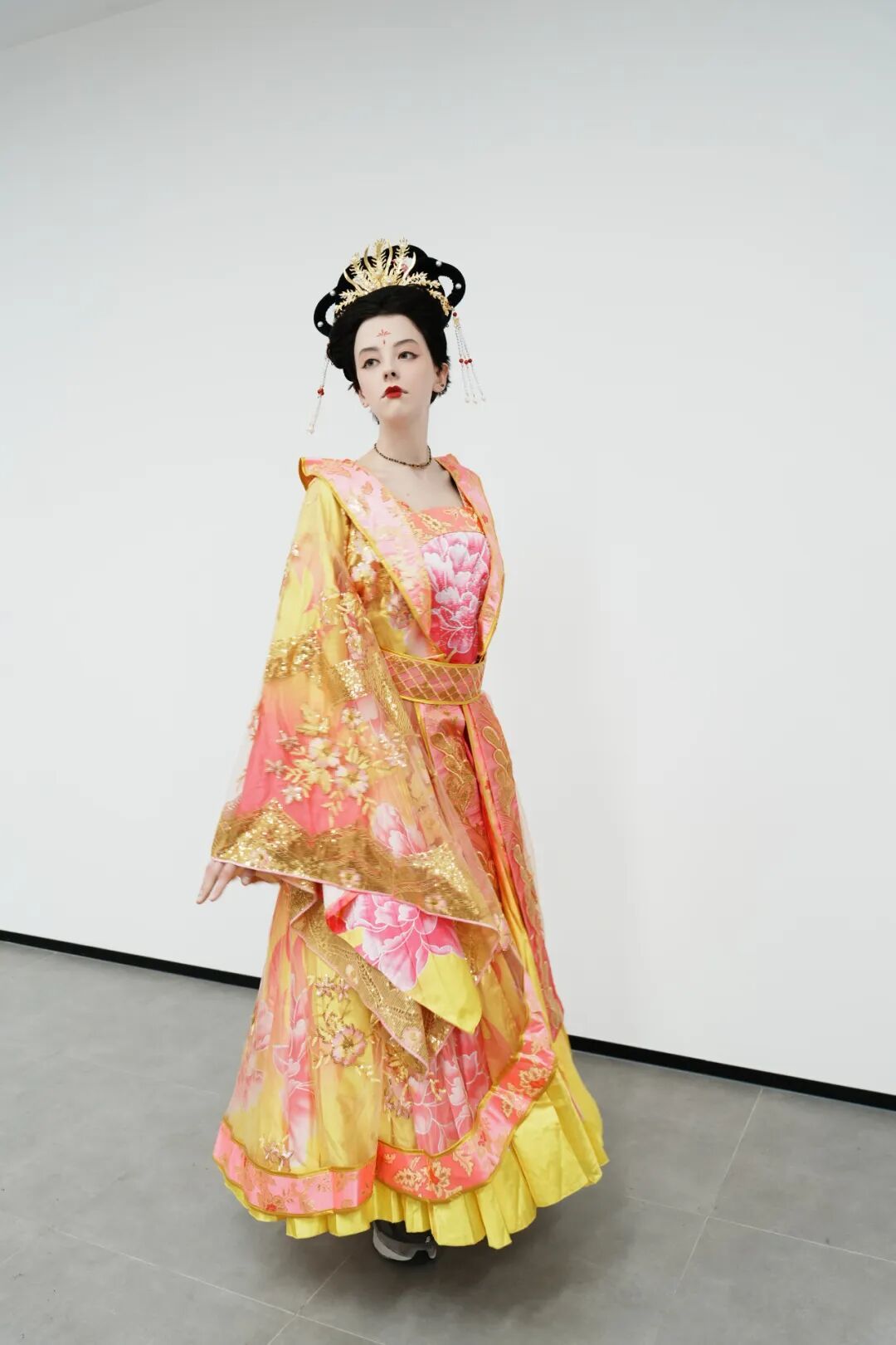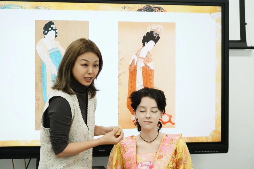 不仅如此,结业课程还特设了中式传统妆造体验专场。课程串联四大非遗项目的文化精髓,现场梳理了汉唐服饰流变脉络,并进行了妆造的实操示范。老师还邀请两位同学上台,体验模特角色,一边拆解妆容服饰背后的文化密码,一边展示妆造技艺的精妙细节,让千年中式美学在眉眼流转、衣袂翻飞间生动落地,将文化体验、趣味性与中式美学融为一体。