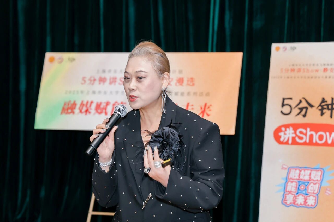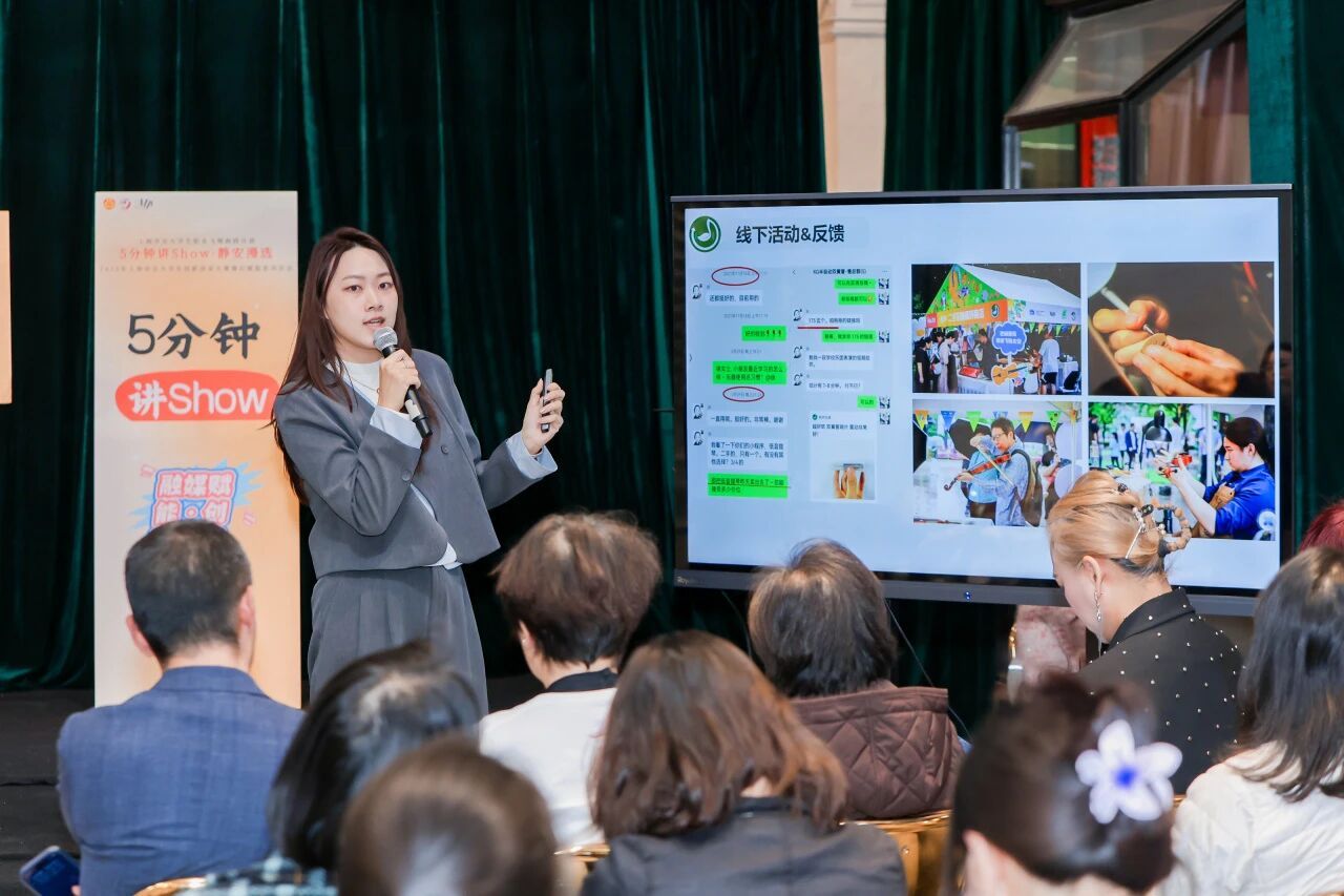 为进一步提升学生的商业沟通与项目展示能力,本次活动延续了“5分钟讲Show”特色环节。漫选创始人李丽、“再声”平台创始人蔡婧怡、“青出艺蓝文化科技”创始人张丹青、上海大学李靖雯、东华大学白乙灵等5位来自不同领域的嘉宾分享创业理念与实践成果,项目涵盖私域流量、乐器回收、文化传播、社群电商与人工智能等多个领域,展现青年创业者的多元视野与创新活力。