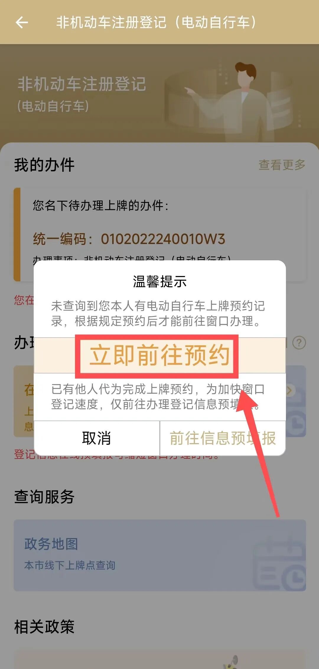 以往的电动车上牌流程,需要先下载“上海交警”App,进行非机动车业务预约,再到“随申办市民云”App进行线上信息预填写,并查询附近的“上牌点”。如今随着“上海交警”App融入,线上预约的全流程都可以在“随申办”上搞定。