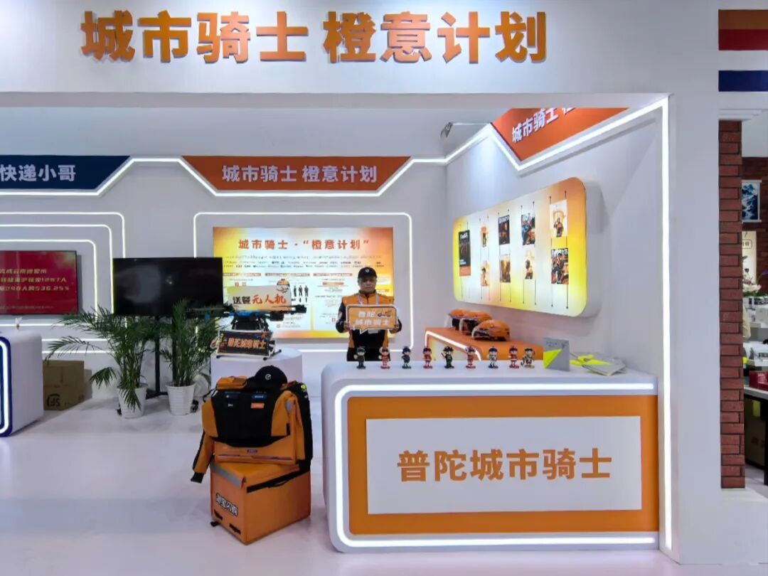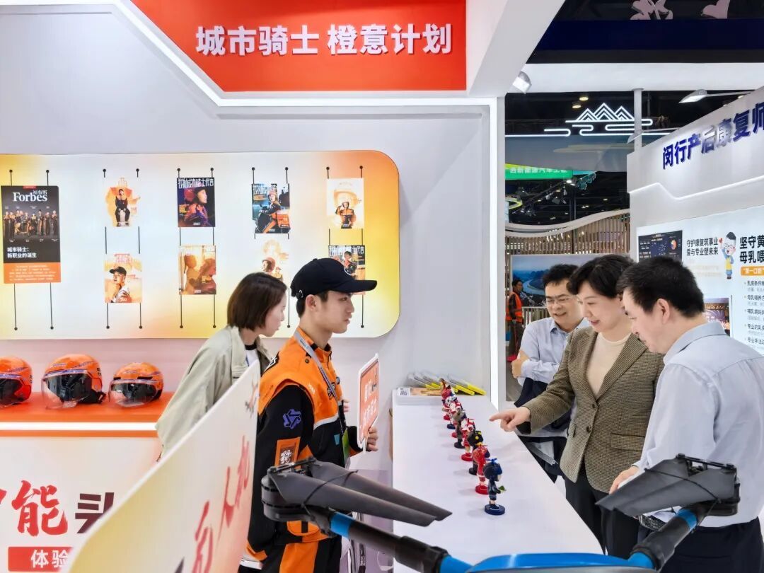 展厅内,通过滚动播放劳务品牌宣传片,摆放展示无人送餐机和智能头盔等城市骑士装备,呈现完善的“橙意计划”——骑士福利保障、关怀激励和成长发展体系,全方位介绍了“普陀城市骑士”劳务品牌所取得的多维成效和社会价值。展览期间,参观者们通过试戴装备等互动环节,共同探寻与感受这一劳务品牌的魅力与特色。