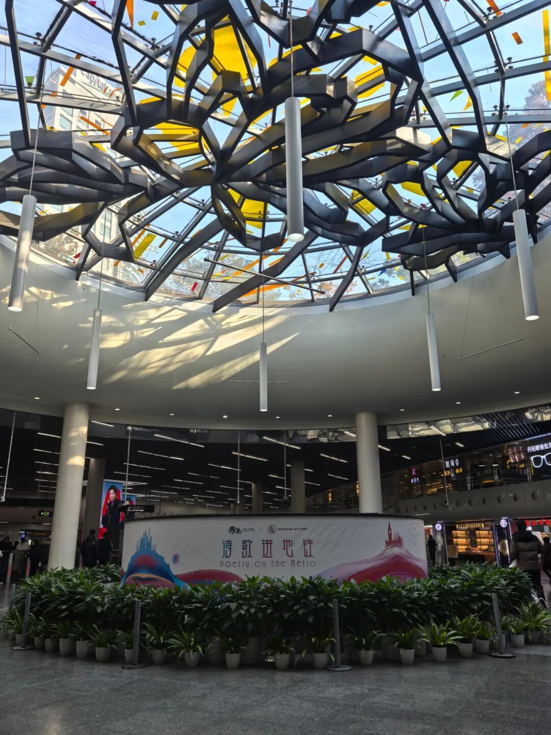 11月19日下午,在上海市人民政府新闻办公室指导下,上海地铁公共文化“奔流-诗歌进地铁”专列首发仪式在人民广场站“上海地铁音乐角”举行。来自中国《诗经》的《关雎》、英国著名诗人拜伦的《She Walks in Beauty她走来,风姿幽美》等8首中英诗歌将用为期一个月的时间,在2号线和网络端,以视觉、听觉等方式与市民乘客见面。这些诗歌被印制成多彩的海报出现在2号线地铁车厢、车门、拉手等区域,海报上印有二维码,乘客只需拿出手机扫码就可听到中外嘉宾为您品读诗歌经典。同时,也可通过“阿基米德APP”首页的“诗歌进地铁”专区内,同步听到列车上面嘉宾诵读的诗歌音频。