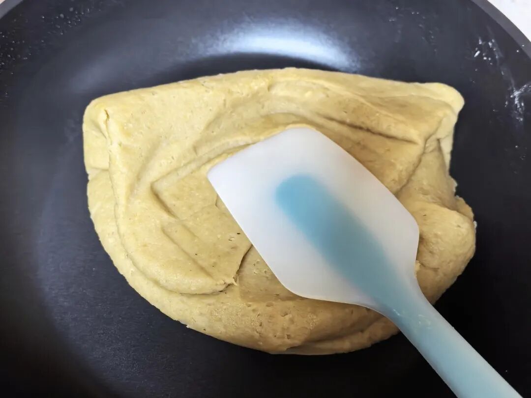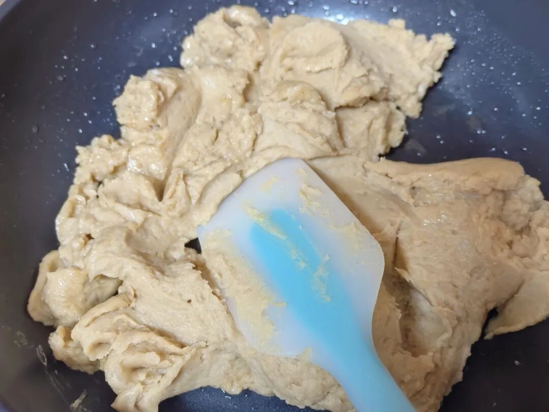 7.不粘锅加热,放入15克黄油,稍融化后倒入栗子泥,小火不断翻炒;