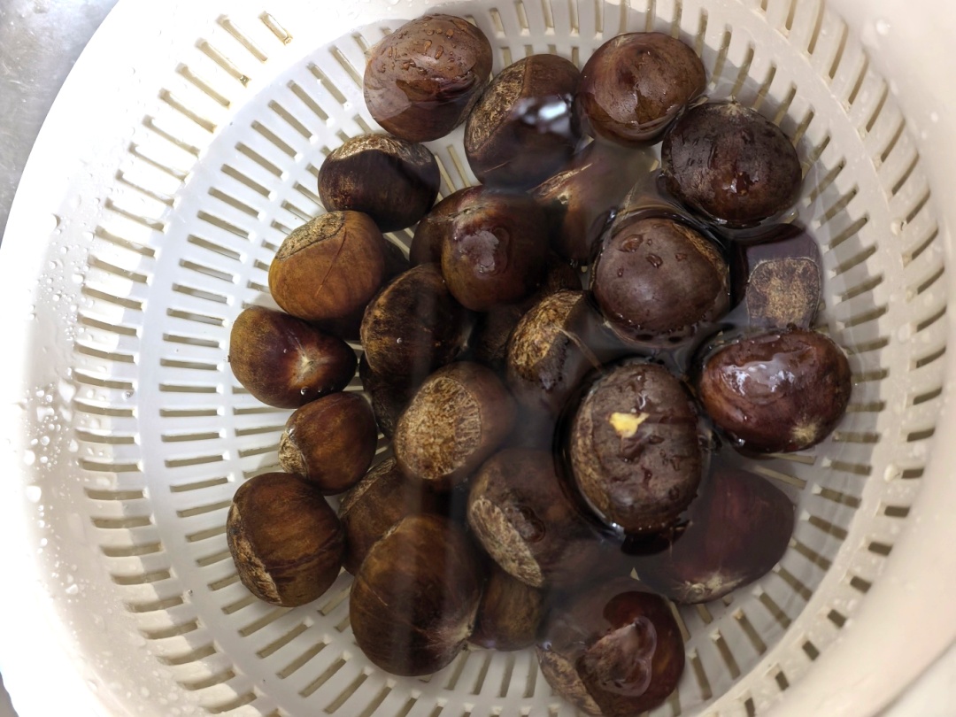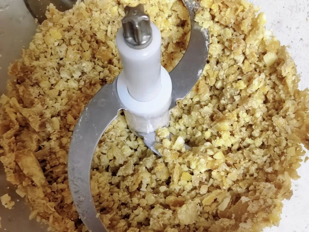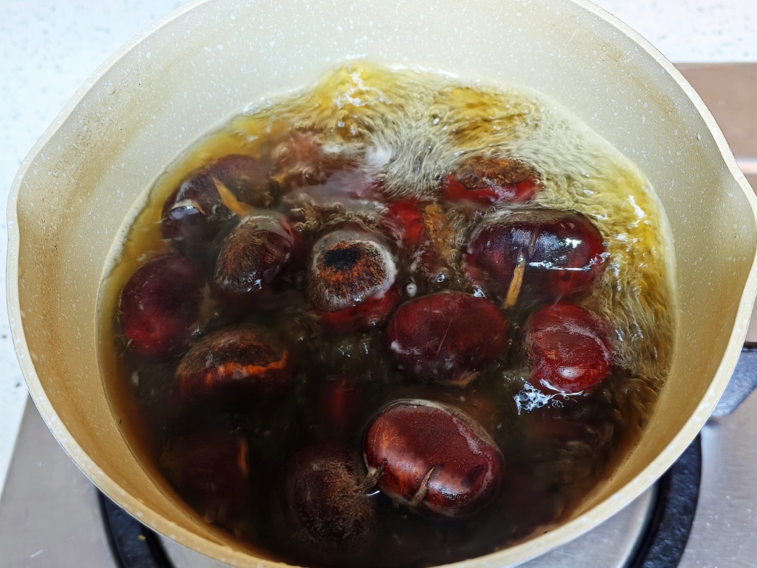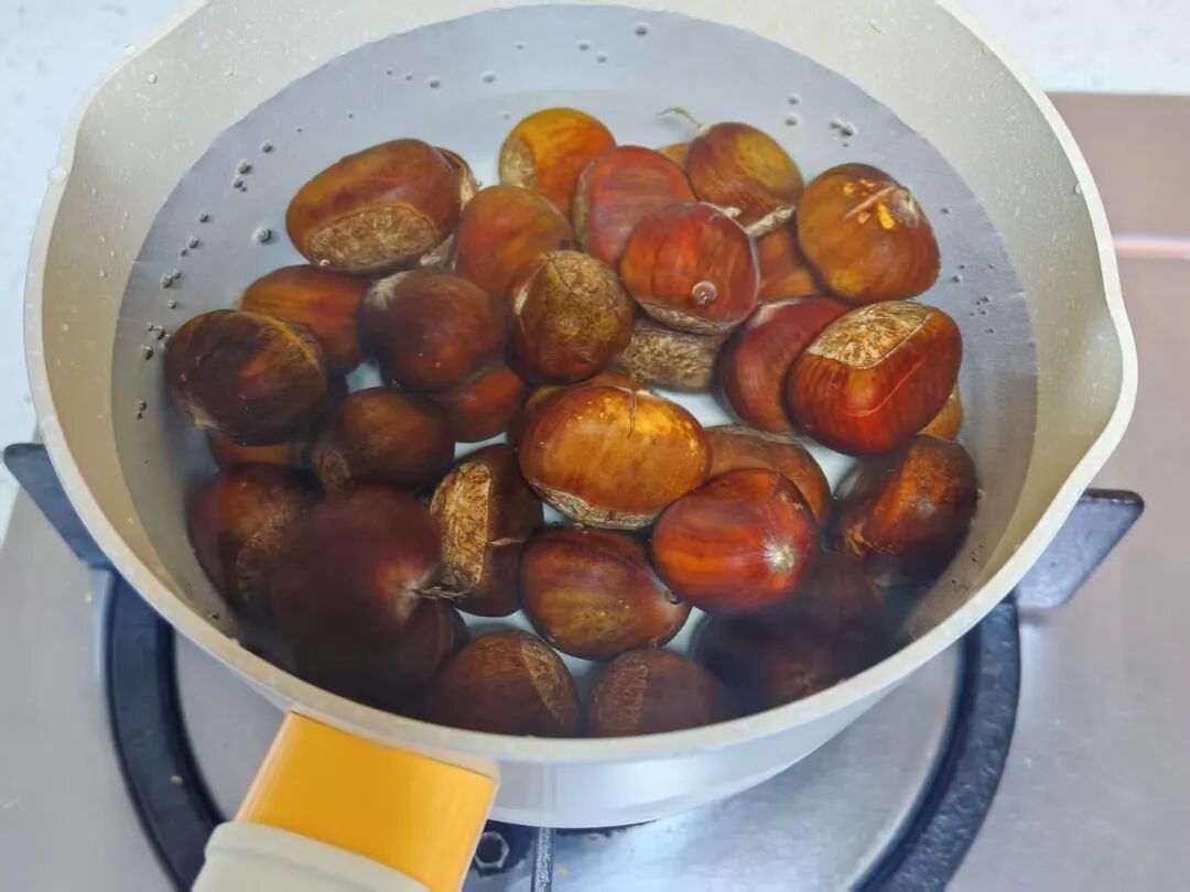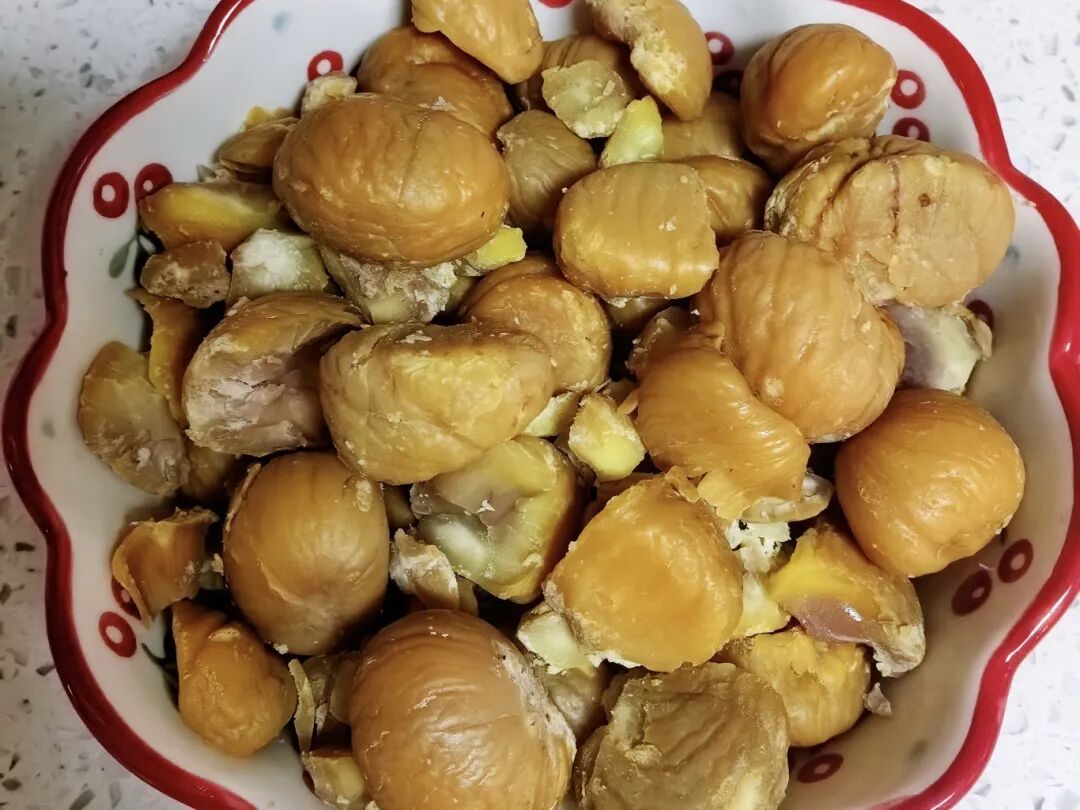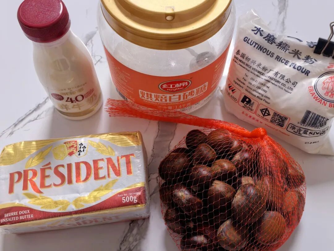 6.栗子仁放入破壁机或者搅拌机,倒入130克牛奶和20克白砂糖打成泥;