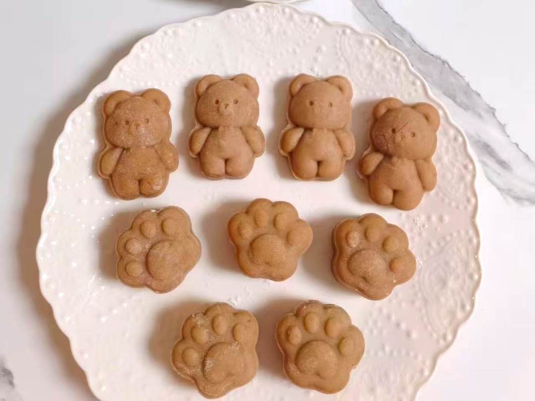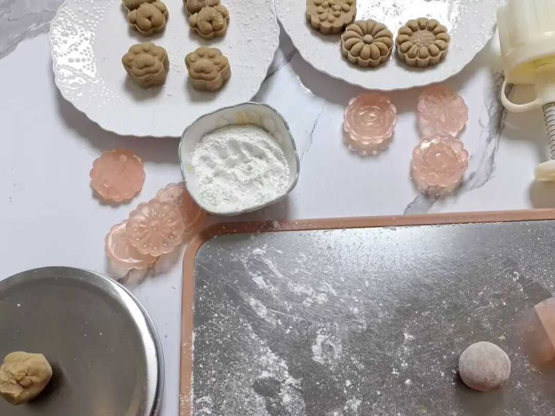 9.均分成25克的小剂子,滚一点炒熟的糯米粉,放入喜欢的模具压出形状即可完成。