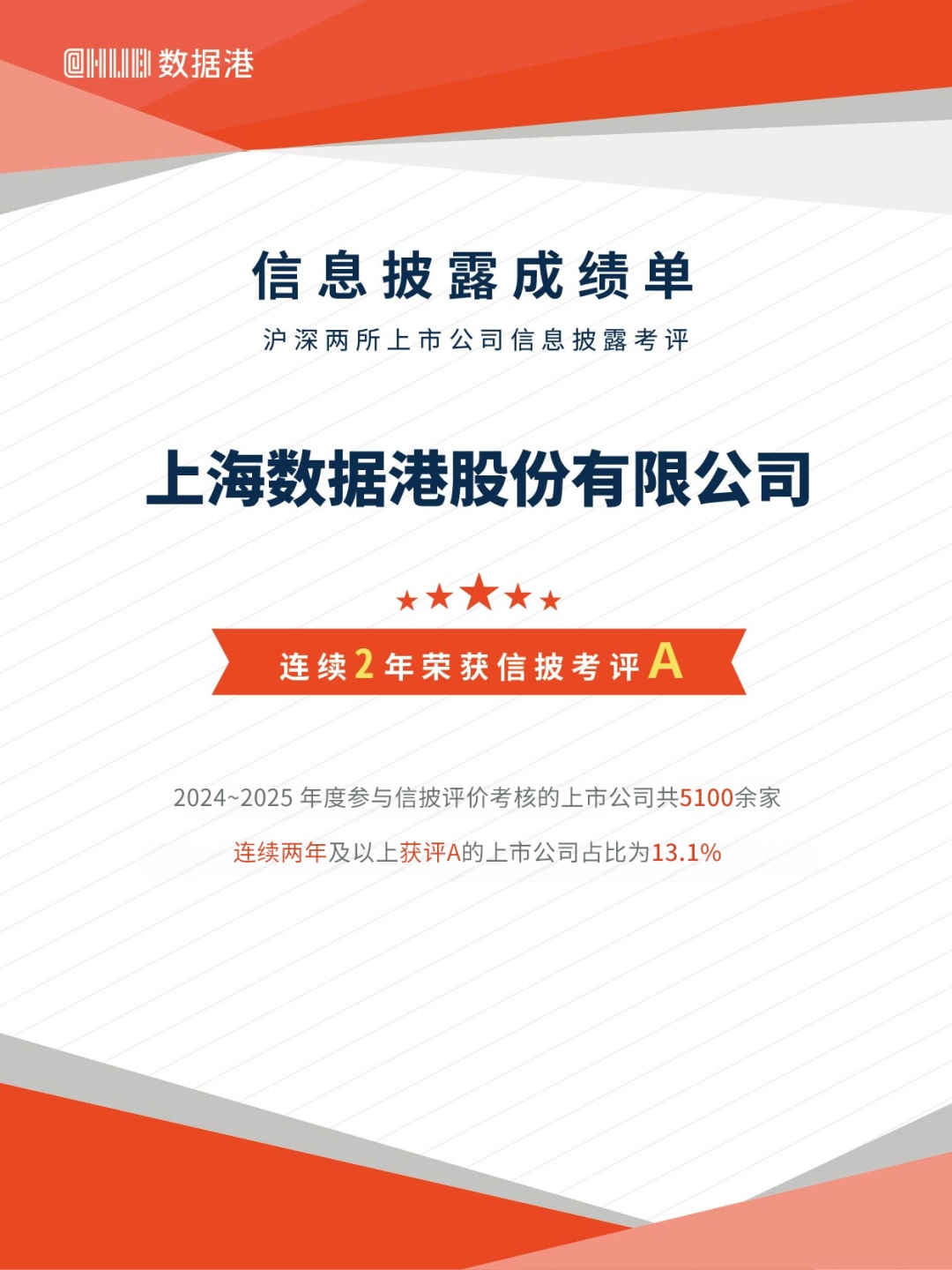 近日,上海证券交易所公布2024—2025年度沪市上市公司信息披露工作评价结果,市北高新旗下上海数据港股份有限公司(以下简称“数据港”)再度斩获最高等级A级评价。