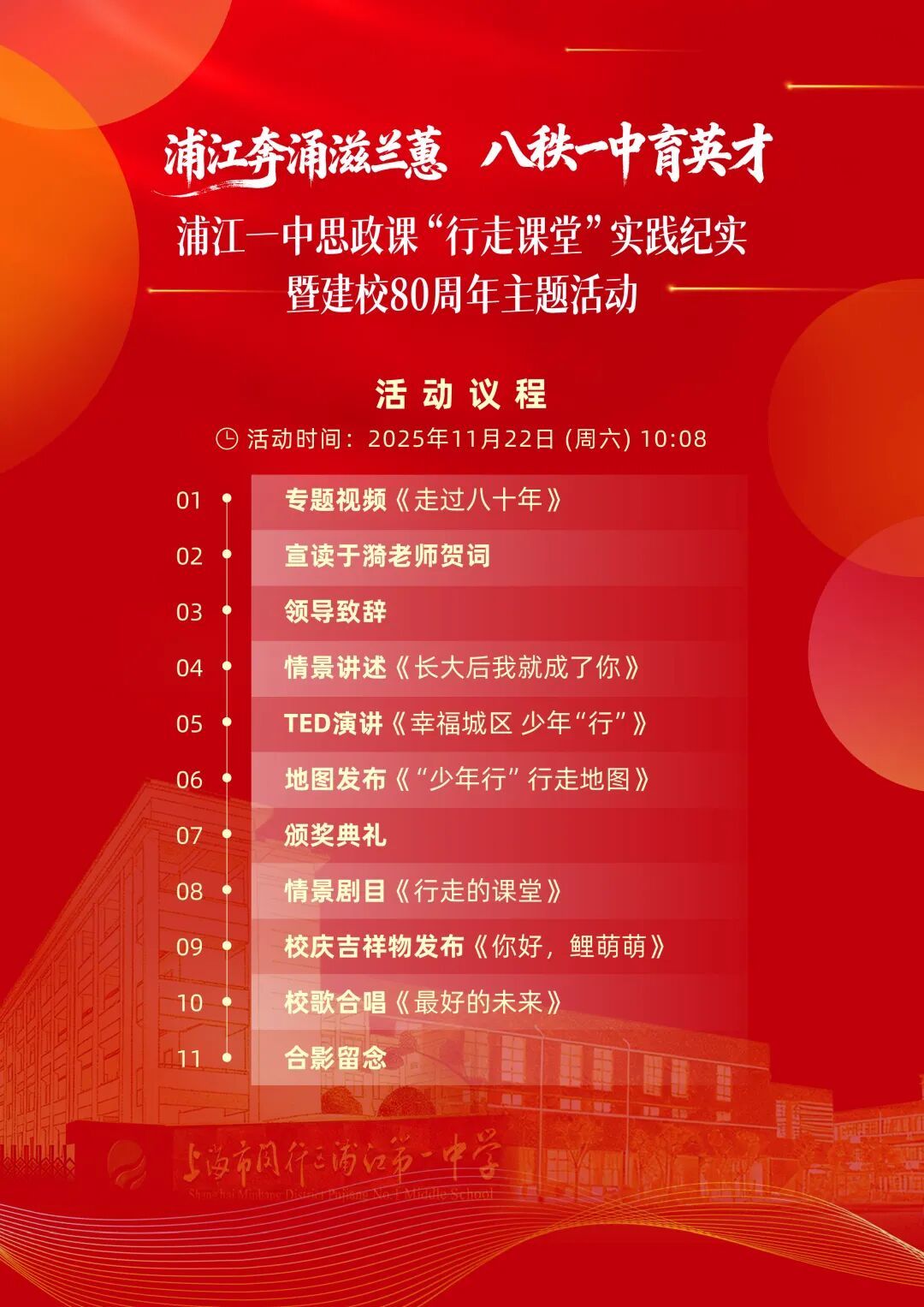 八十载光影流转、岁月如歌 八十载奋斗不息、一路跨越 从1945年到2025年 浦江一中已走过80年的岁月旅程 为庆祝浦江一中建校80周年 本周六8:00“今日闵行”客户端、视频号 让我们用一场特别的直播 共同开启浦江一中发展新篇章 亲爱的校友、朋友们 欢迎您在评论区留言 为浦江一中送上美好的生日祝福