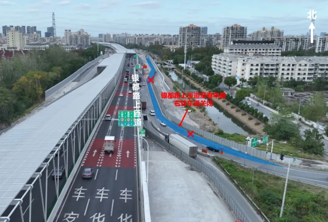 同时,金都路上行匝道开放后,原银都路上匝道至春申路右转车道将在金都路北上匝道启用后停止使用(见下图)。