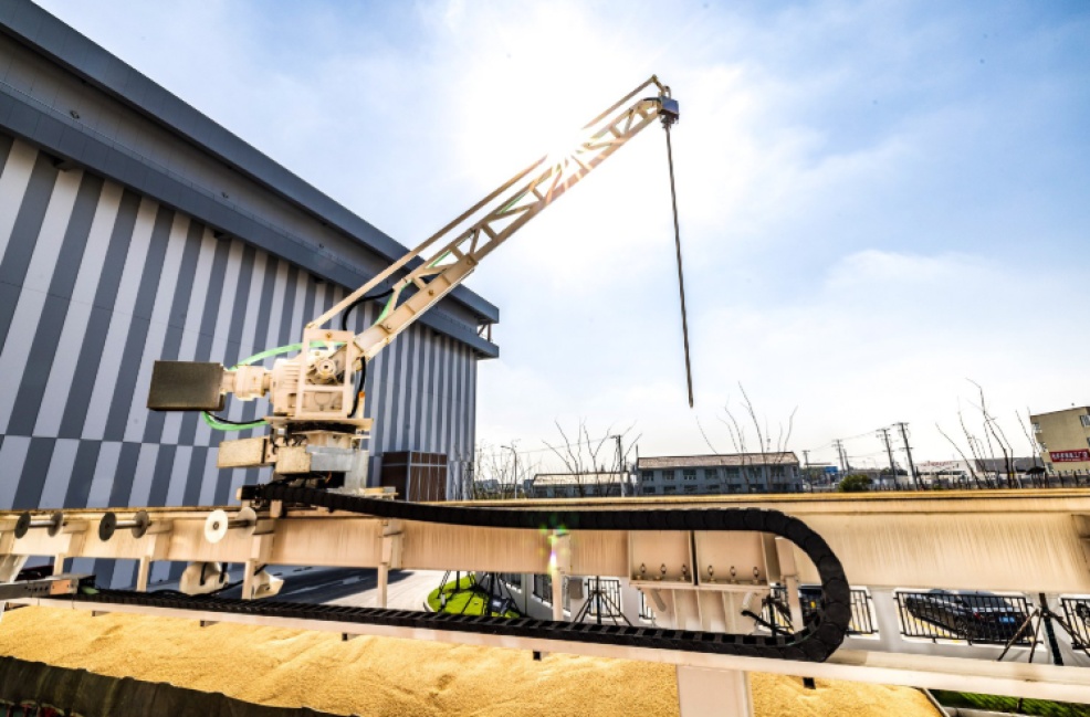 稻谷落入“地下”后,随即进入集接收、提升、清理与计量功能于一体的提升塔,被送往约5层楼高的双壁方筒仓顶层。放眼顶层,11排输送管道整齐排列,每排对应5个储粮仓,共同连接双壁方筒仓中层55个独立廒间,实现粮食分品种、分等级存储,土地利用率较传统平房仓提升4倍。