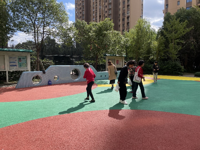“改造完的这个场地脚感特别软、特别平整!我们现在每天都来这里走一走!”秋日的阳光下,金枫里小区的几位阿姨正在焕然一新的塑胶健身场地上散步聊天。