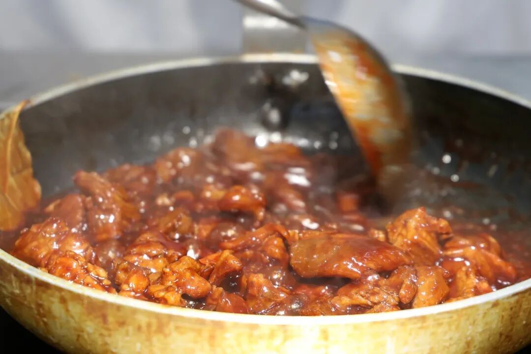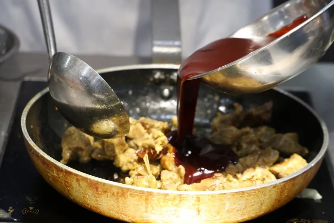 4. 倒入用海鲜酱、花生酱、生抽等熬制的酱汁焖烧入味;