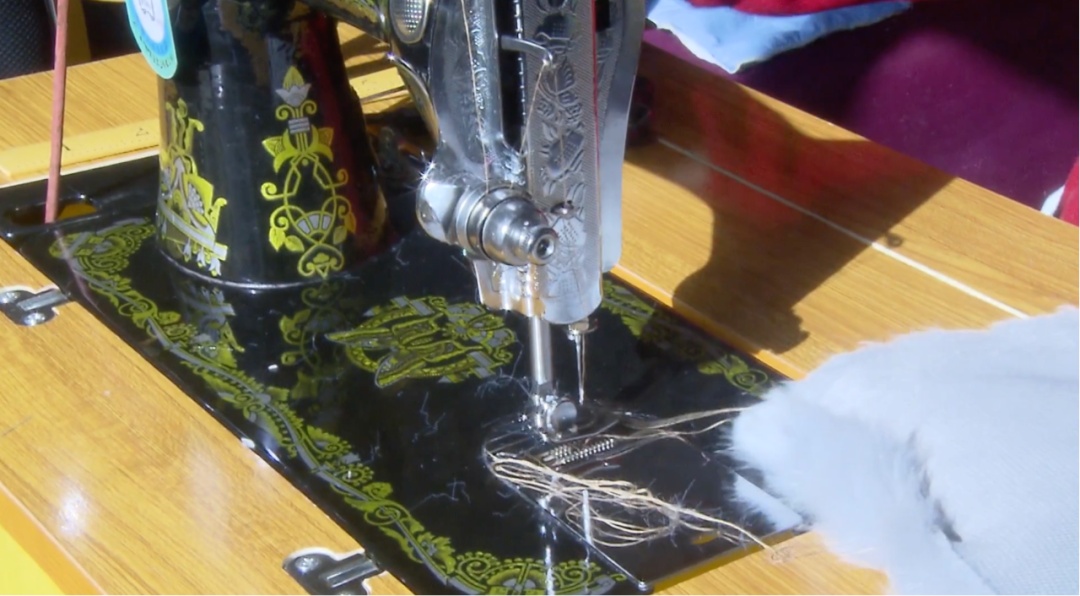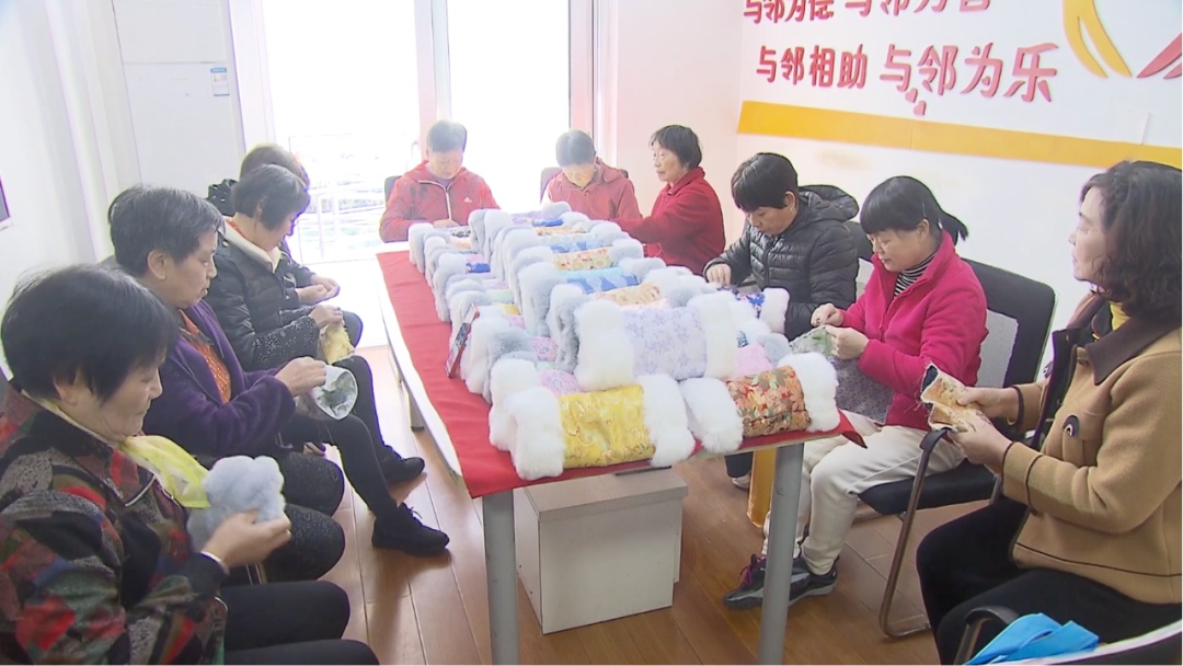 活动室里,阿姨们正干得热火朝天,大家分工有序,配合默契。负责裁剪的阿姨将布料预先分成合适尺寸,再交由姐妹们进行缝合。丝滑的丝绸、蓬松的丝绵、柔软温暖的兔毛在她们手中被精心组合、细细缝合,阿姨们互相讨论着,说说笑笑间自己分工的部分就完成了。