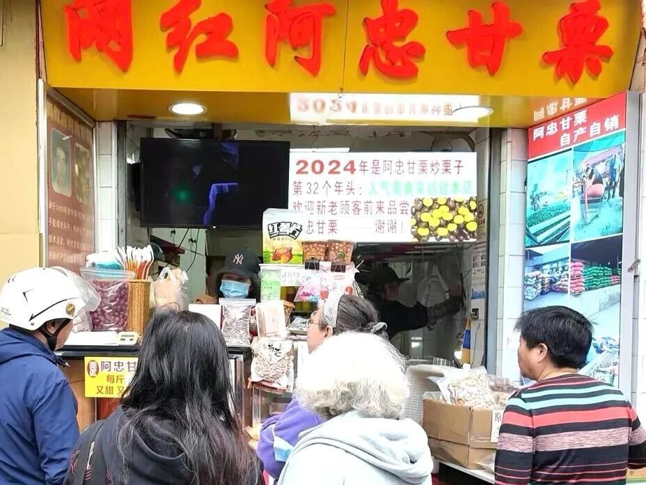 与此同时,在石泉路街道经营了八年的阿忠甘栗也同样热闹——这家店的栗子生意其实已坚守整整三十三年。一位买了两斤栗子的老顾客与老板熟络地寒暄着。“我是他家的老主顾了,从四川北路吃到镇坪路,他开到哪我就追到哪。”买好栗子,他又帮老板打起了“广告”:“这家的栗子颗粒饱满,从来没吃到过坏的,信誉特别好,我已经推荐给很多人了。”